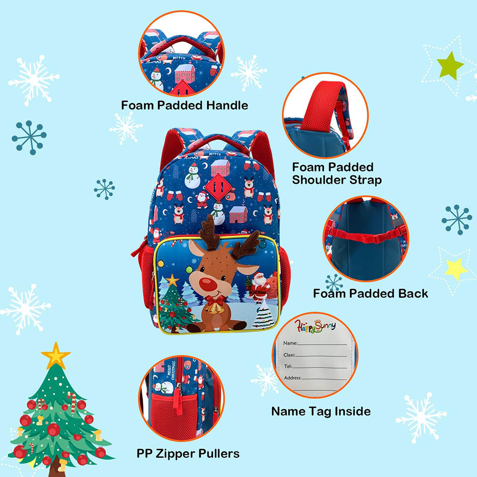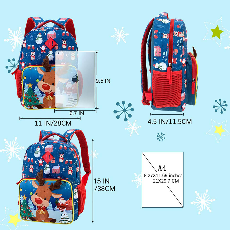 ⭐【Reindeer and Accessories】: Durable and lightweight 300D Oxford fabric with a better handle feeling for kids, cartoon designs all over the child-friendly material. Foamed padded shoulder straps, handle, back part, and bottom of this kid's backpack with a chest belt. Name tag holder hanging on the handle. Durable smooth zipper closure.Two elastic mesh pockets for bottles, snacks, or umbrellas. ⭐【Multipurpose】: A cute reindeer backpack is suitable to be used as a Christmas gift, a preschool backpack for kids, a book bag for boys and girls, hiking backpack for kids. The breathable mesh pad under the shoulder straps and the handle is comfortable and relaxed for children when they go to school, travel, park, zoo, hiking, and other outdoor activities. ⭐【Measures】: 11.3x 4.7x 15inches/28x11.5x38cm(LxDxH), the main compartment with laptop sleeve inside is big enough to fit some standard folders, lunch bag, snacks, pencil pouch, or any other necessities for children. Also, the front pocket can hold small items like pens, keys, cards, snacks, tissues, etc. |
