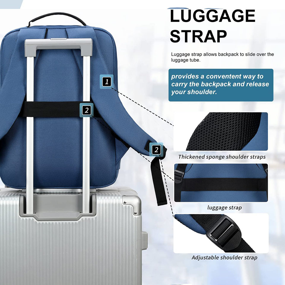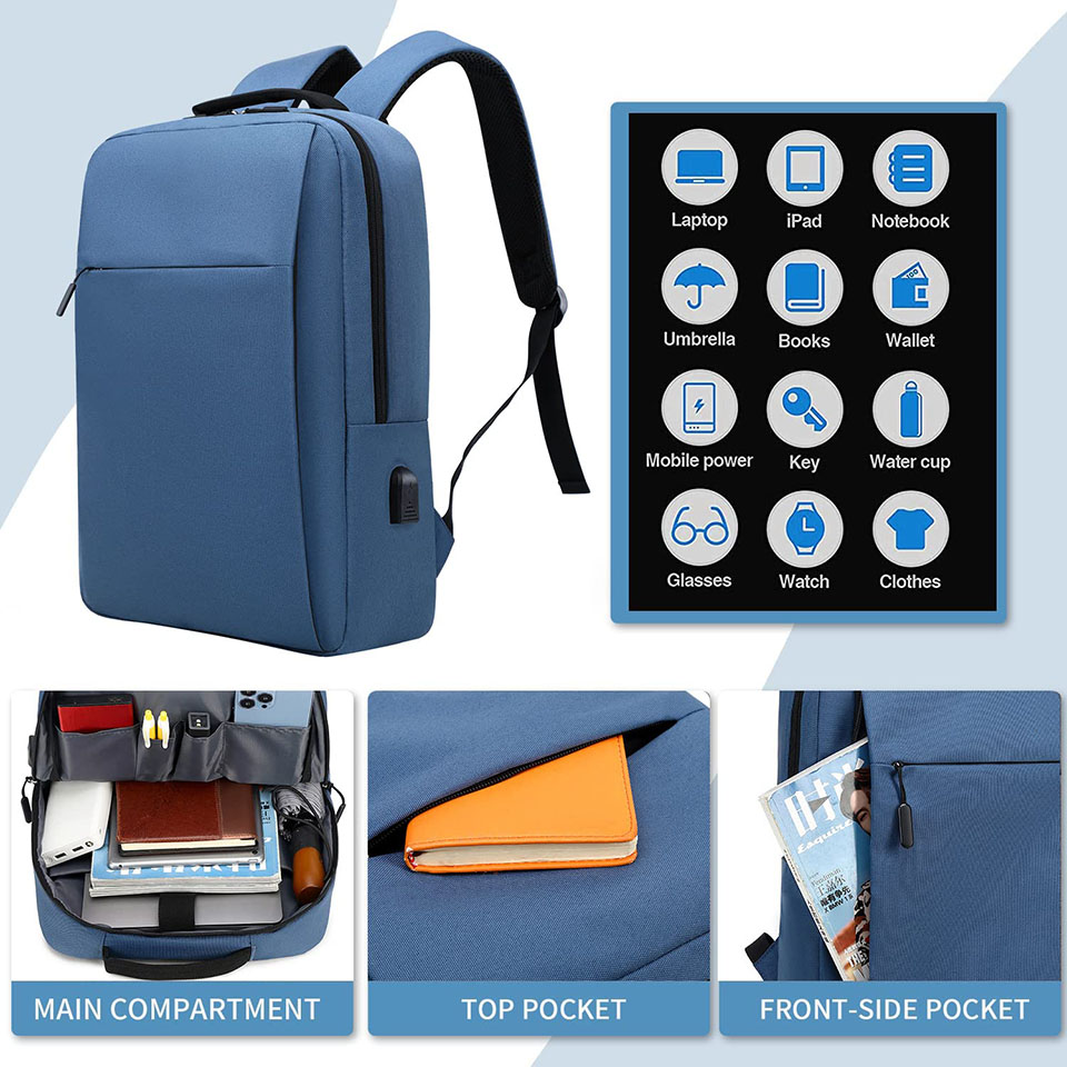 【STORAGE SPACE&POCKETS】One separate laptop compartment holds 15.6 Inch Laptop as well as 15 Inch,14 Inch, and 13 Inch Laptop. One spacious packing compartment roomy for daily necessities, tech electronics accessories, and a bunch of other items, make your items organized and easier to find. 【FUNCTIONAL】A luggage strap allows the backpack to fit on luggage/suitcase, and slide over the luggage upright handle tube for easier carrying. Well made for international airplane travel and day trips as a travel gift for men. this USB backpack offers you a more convenient way to charge your phone while walking. Please noted that this backpack doesn't power itself, the USB charging port only offers easy access to charge. When cleaning the backpack, remove the USB charging line. metal zippers. Ensure secure & long-lasting usage every day & weekend. Serve you well as a professional office work bag, slim USB charging backpack, and college backpack for men and women. bottle, readers and a bunch of other items, iPad, journal, pens and pencils, iPhone. The Notebook Computer Bag Side pocket accommodates compact umbrellas and other small items.