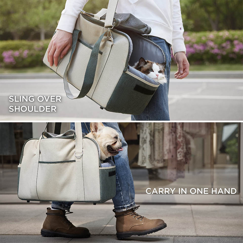 This pet carrier provides two connecting loop handles for balanced carrying as a dual seat belt or luggage strap to secure transport.And it is easy to carry and store, which has a padded shoulder strap and handles.
