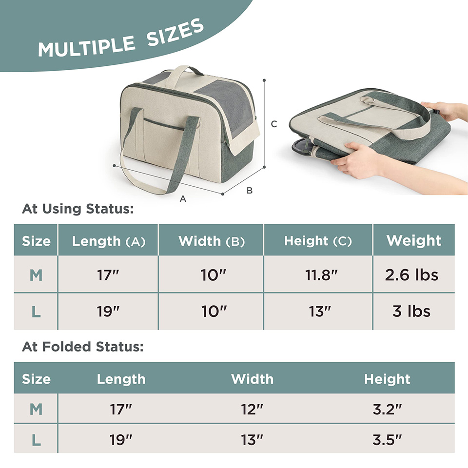 * Multiple Sizes: Our small dog carrier comes in two sizes – size medium (TSA-approved) measures 17x11.8x10" and size large measures 19x13x10''. This soft pet carrier is machine-washable for easy care.