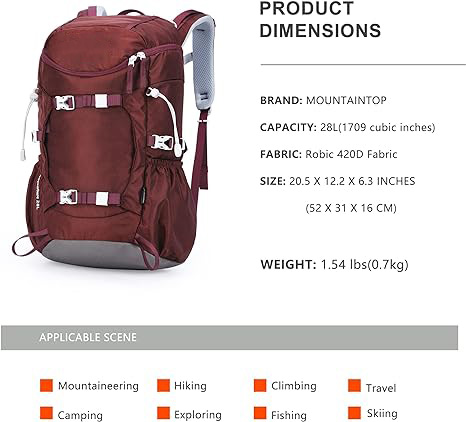 This lightweight Mountaineer trekking backpack is designed for minimalist travelers. Made from water-resistant 420D fabric with high-quality YKK zippers, it's durable and weighs just 0.7kg. With a 28L capacity, it's perfect for 1-2 days of outdoor adventure, featuring a spacious main compartment and multiple pockets for easy organization. Adjustable shoulder straps and waist belt provide comfort, while trekking pole loops and compression straps accommodate additional gear. It's hydration bladder compatible for added convenience (hydration bladder not included). |