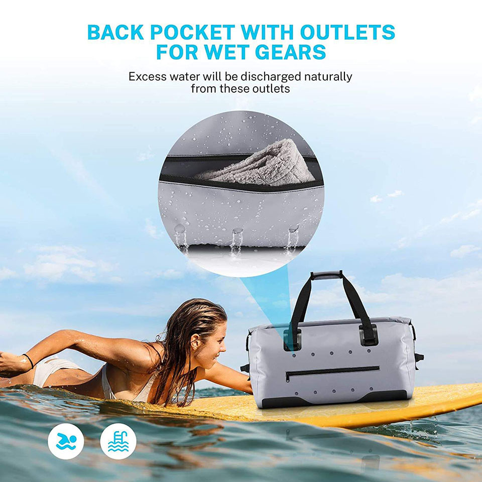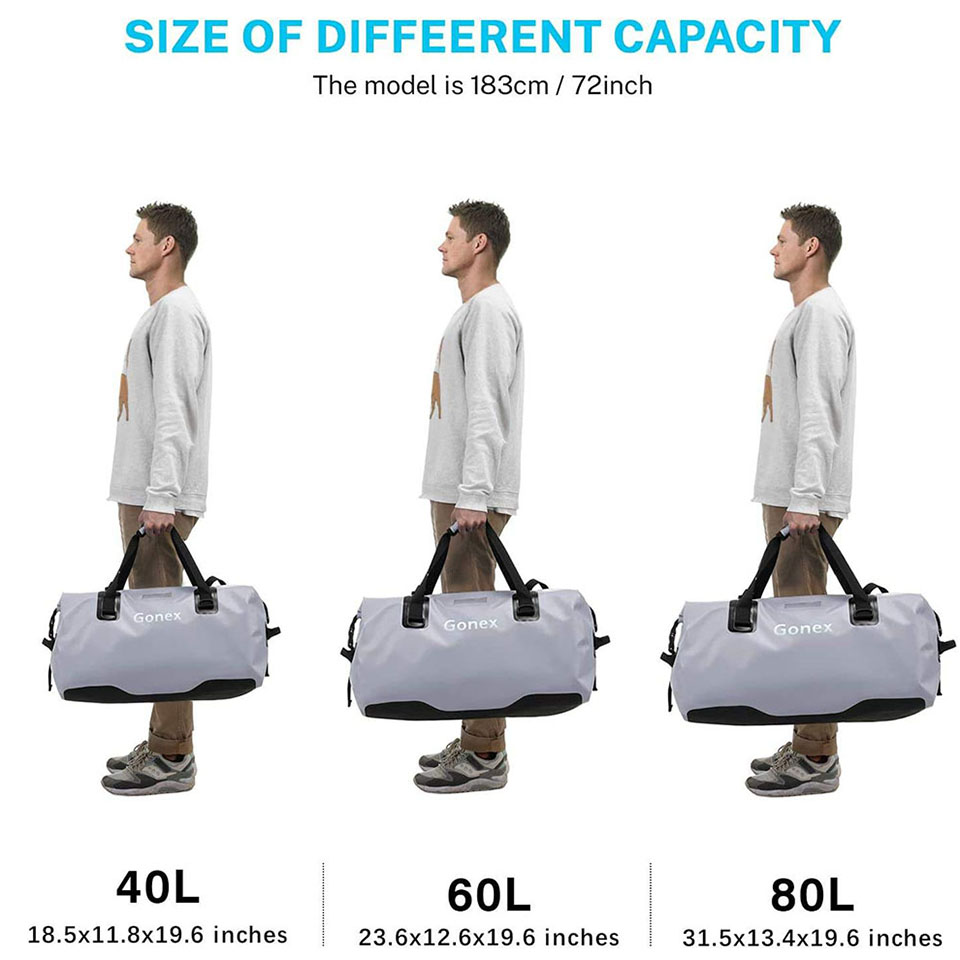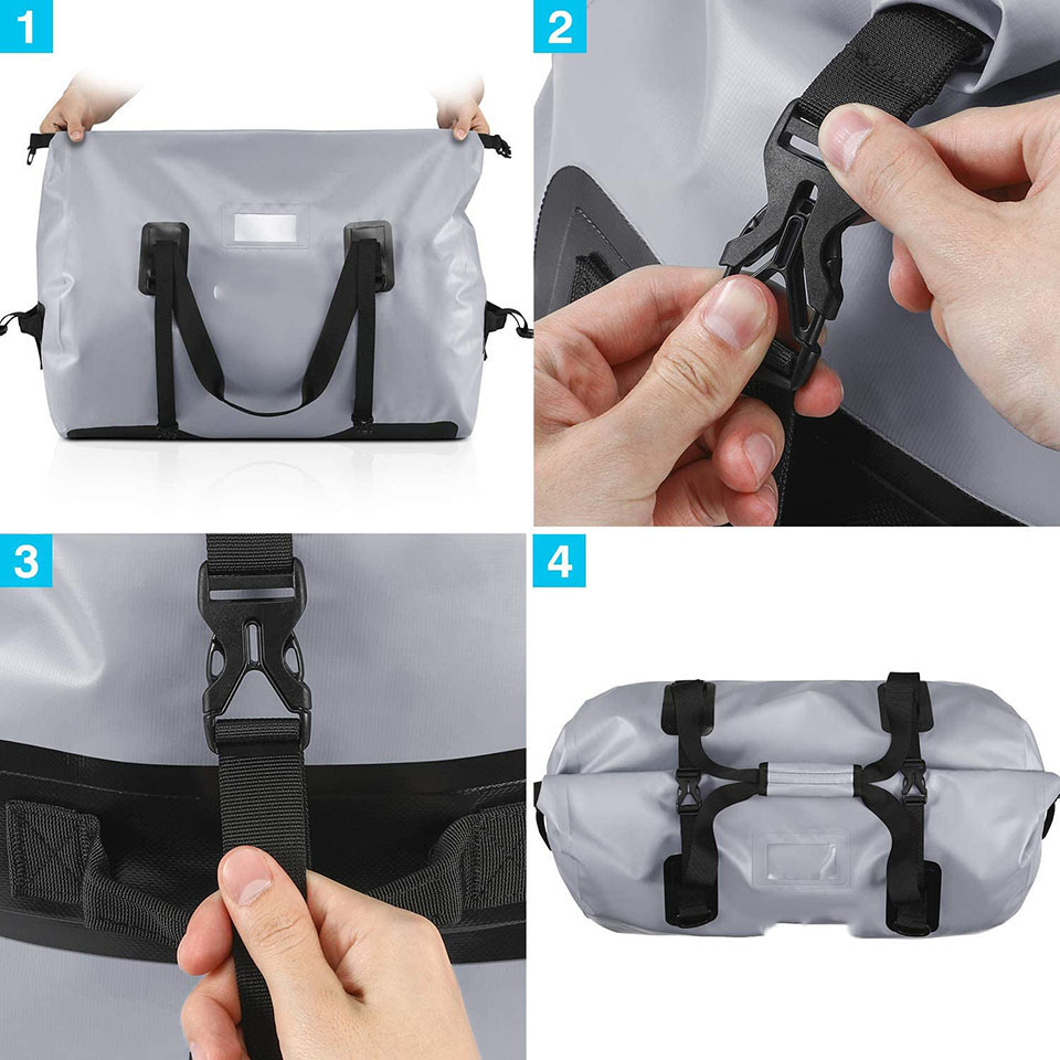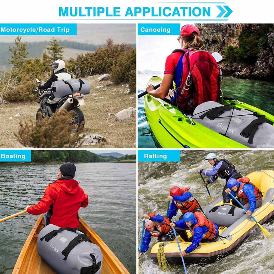 by hook & loop with easily rolling top. Rolling it 3/4 times and fixing with the strap to keep all your items ideally dry. * 【Scientific Design】Back nylon zip pocket with some outlets of waterproof bag is designed to hold wet clothes, shoes, towels, equipment, gear, etc, and excess water will be discharged naturally from these outlets. Sturdy straps are equipped in main compartment, handle and both sides for convenience. Front transparent card window is for easy recognition. * 【Three Carrying Ways】Straps on both sides for hands lifting, top handle for hand carrying and adjustable straps for cross body or shoulder carrying. This waterproof duffel bag is flexible for you to carry under different occasions. * 【Multiple Uses】With its effective waterproof, this waterproof dry bag is suitable for most of outdoor activities, such as kayaking, paddleboarding, boating, motorcycle, rafting, fishing, diving and other adventures. * 【Multiple colors & size】We use high quality waterproof material and scientific design. This waterproof dry bags with Multi-color and multi-size options can meet many outdoor activities. We stand behind the durability of our goods. If you have any questions, please feel free to contact us! |