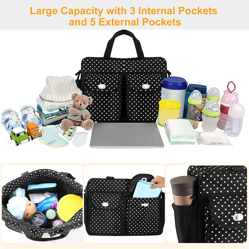 Description:Ultra light weight Organizing Mommy Diaper Bag Color:Polka dots Dimension:18"L x 6"W x 12.75"H Lining:210D