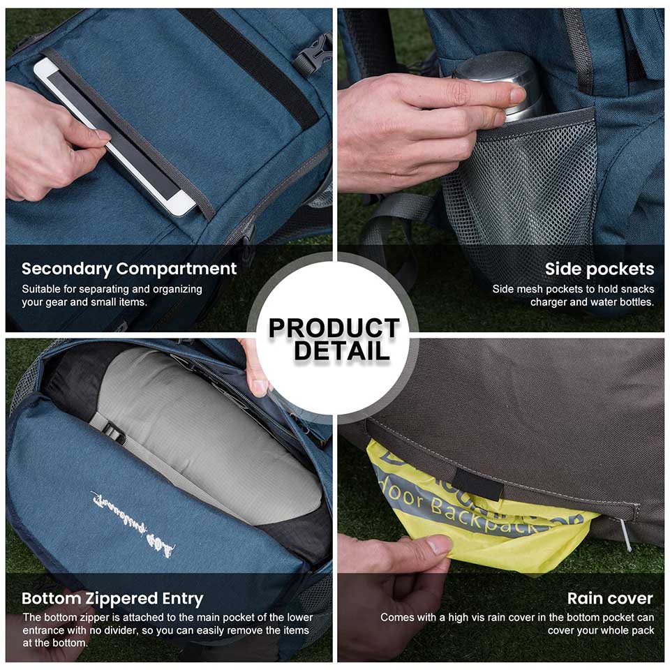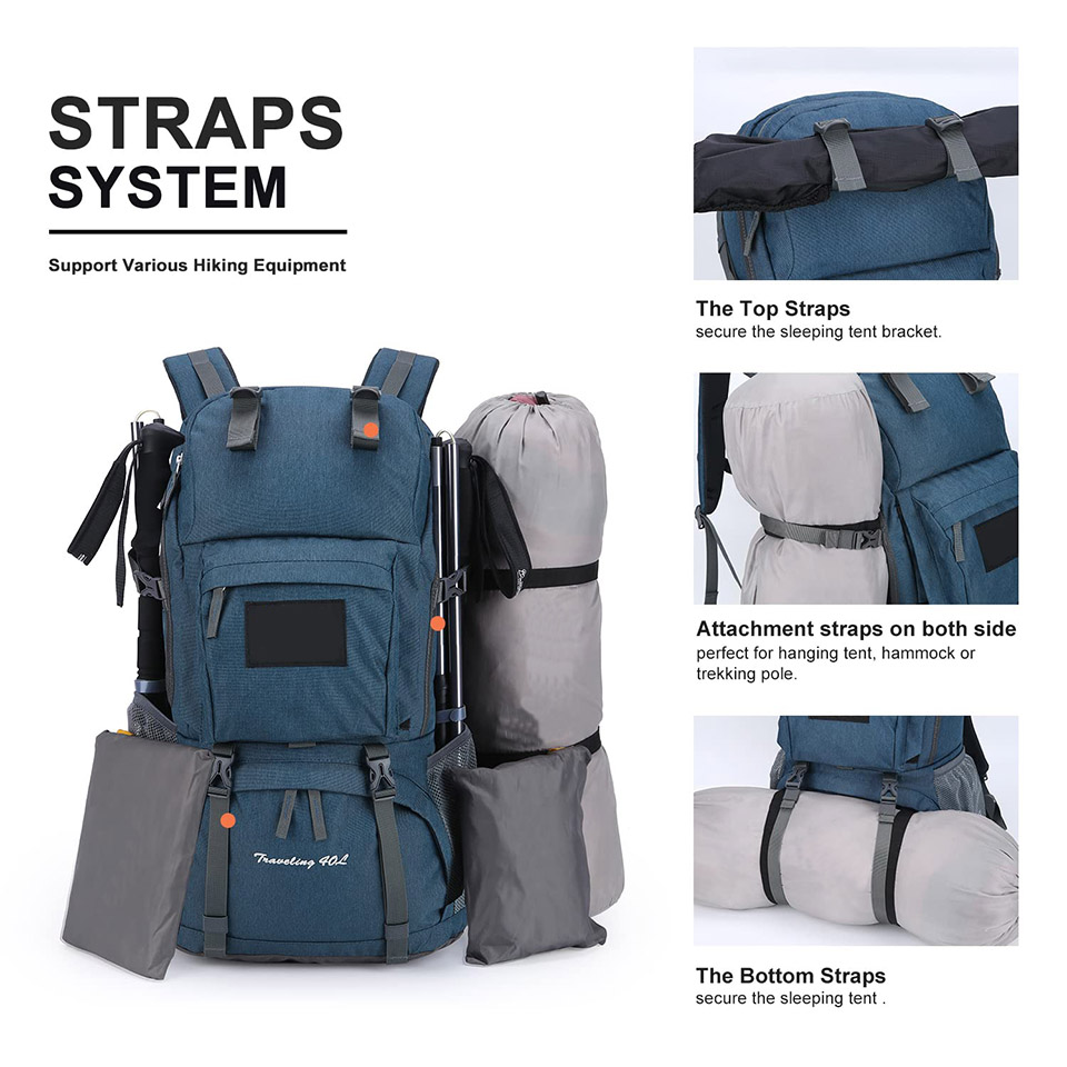 Essential details Application: Outdoor, Sport, Travel, Hiking, Camping, Cycling Material: Polyester Capacity: 28L/43L/53L/63L Color: Customized Certificates: BSCI,Sedex,TUV,ISO9001 Sample time: 5-7 Days Warranty: 1 year against defect of materials and manufacturing OEM/ODM: Acceptable MOQ: 500pcs read More