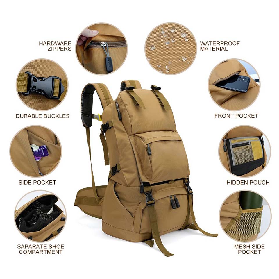 Essential details Season: All Seasons Place of Origin: Fujian, China Feature: Waterproof, Water Resistant Type: Softback Brand Name: Chaumetbags Main Material: Nylon Lining Material: Other Style: Fashion, NATIONAL, Vintage, Japan Style, Moto & Biker, Rock Closure Type: zipper Handle/Strap Type: Soft Handle Pattern Type: Thread Capacity: 50 - 70L Interior: Interior Zipper Pocket Carrying System: Air Cushion Belt Gender: Unisex Product name: Hiking backpack Usage: Outdoor Activity Size: 20 x 10 x 7 inches Logo: Accept Customized Logo Material: Nylon Waterproof MOQ: 500 Pcs Sample time: 7 Days Delivery time: 30-45 Days Packing: 1pc/Poly Bag +