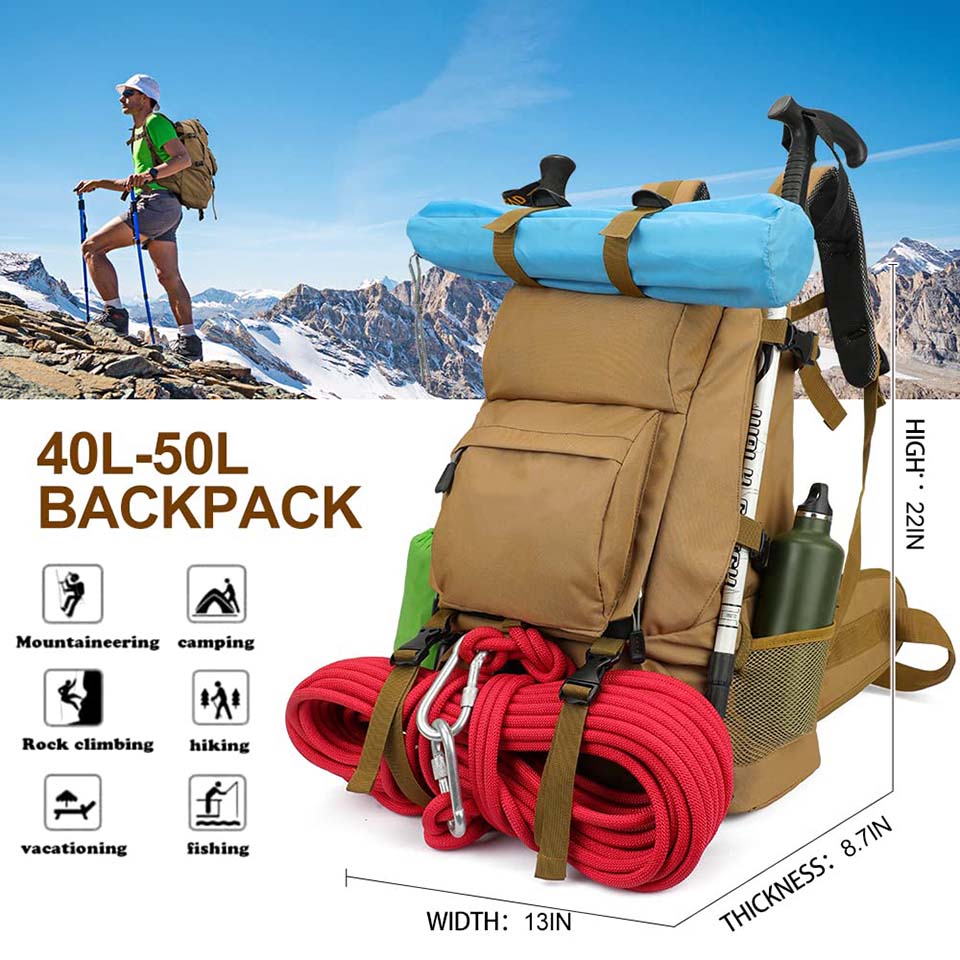 * \uD83D\uDD51【LARGE CAPACITY & INNOVATIVE DESIGN】The dimensions of Our Camping Backpack are 22 x 13 x 8.7 inch with a capacity of 40 liters. 1 main Compartment for a 17"laptop, 3 front pockets, 2 side pockets, bottom pocket are accessible to the main compartment and can help you get items easily without open the main compartment.When you close the zipper on the inside of the bottom pocket, it can be used as a new saperate shoe compartment. * \uD83D\uDD52【MULTI ADJUSTABLE STRAPS】:The Hiking daypack has four side-compression straps to reduce the pack ’s size when it is not fully loaded and it can also be used as hangers for your clothes or other things.Extra compression straps also for binding your belongings such as sleeping bags, tent, hammocks, alpenstock or gears. Mesh side pockets and lower gear loops on side for long item storage. * \uD83D\uDD53【BREATHABLE SYSTEM & WIDE RANGE APPLICATION】:The 40L Hiking bag is well constructed with streamlined suspension system and breathable mesh padding on back, shoulder straps, hip belt for relieving fatigue and ventilation, speed up heat dissipation.Making your trips more comfortable.Ideal comfort for day-to-day use or day trips, vacation, travel, day hikes, school, camping and shopping, and great gift for everyone. |