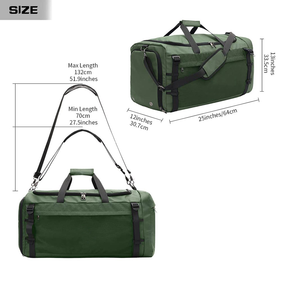 LARGE DUFFEL:25 x 13 x 12 Inches, 65L. Enough space for personal exchange clothes for domestic and international travel as well, you can use it as a sports gym bag, a carry-on bag, a travel bag, and a daily bag, perfect for workouts, rides, gym, yoga, beach, pool,