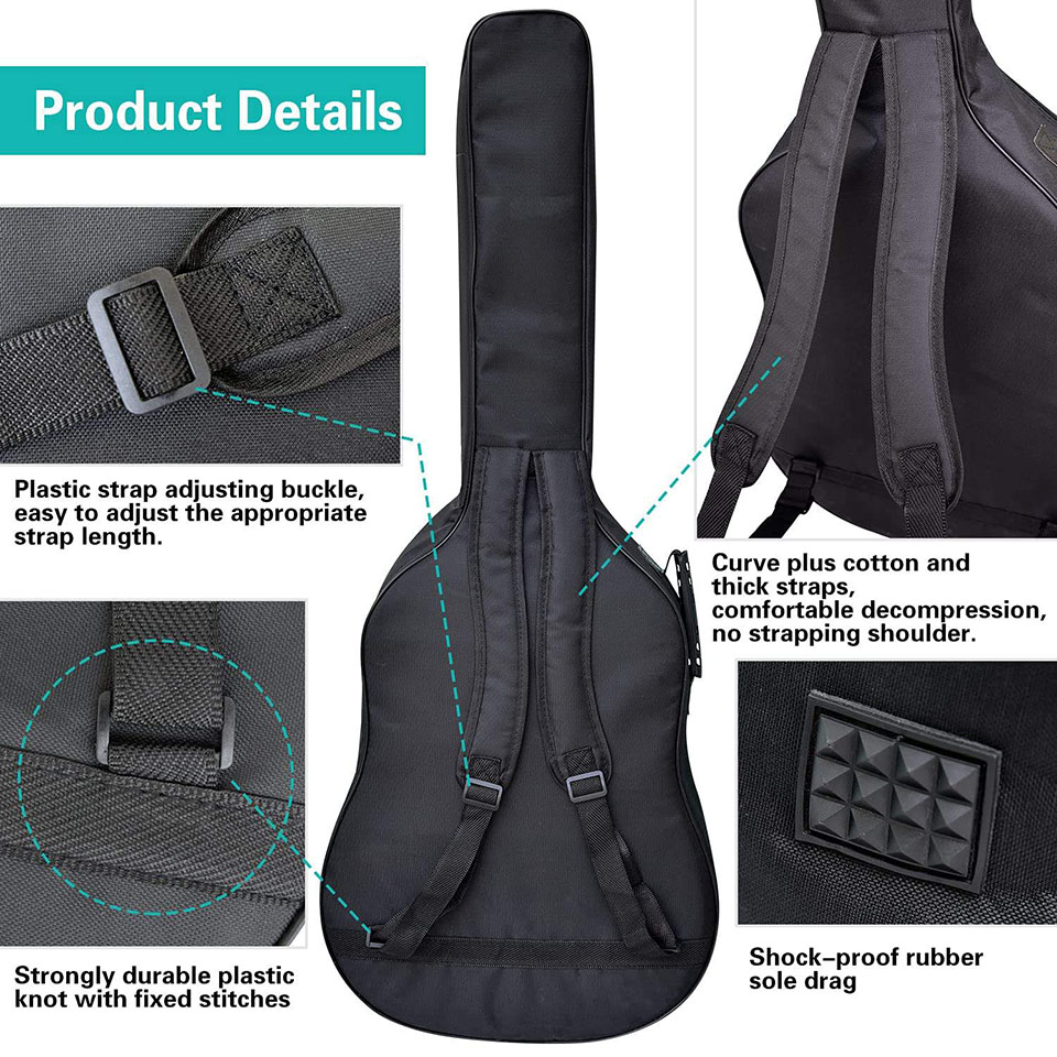 * Features and details Strong and durable: the guitar bag is made of waterproof Oxford cloth and lasts longer. Sponge padding can protect your guitar from scratches, collisions or other damage.