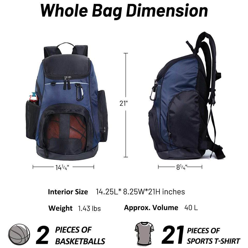 14.25(L)* 8.25(W)*21(H) inches, capacity: 40L; Adjustable sternum strap and waist strap to balance the load when you're