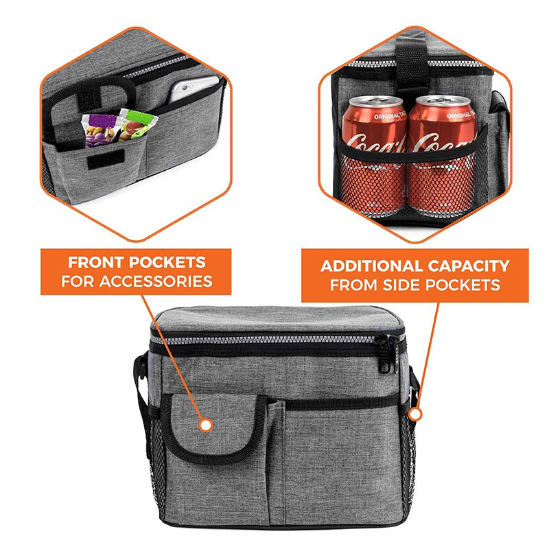 Two Separate insulated compartments. Front zippered pocket and two side mesh pockets INTENDED USE: Cooler, Lunch Cooler, Soda Can Insulated Holder, Picnic Cooler, Lunch Pail This cooler bag is perfect for a daily lunch pail or picnic outing for 2 Comes with Top insulated compartment and side mesh pockets to hold whatever you need. Comes with a carry strap for easy carrying to and from work.