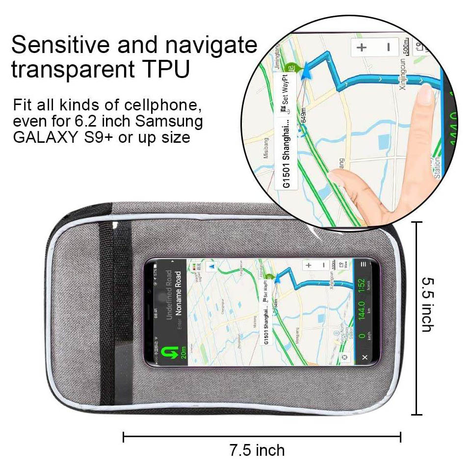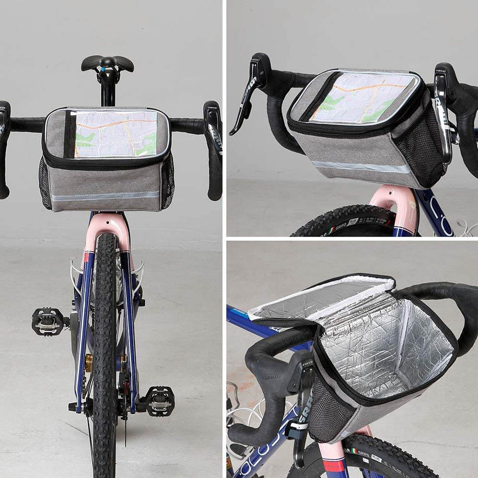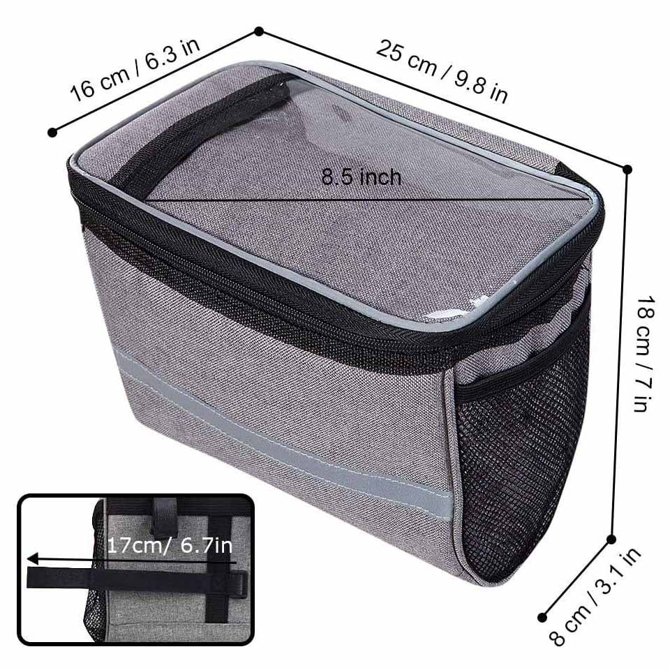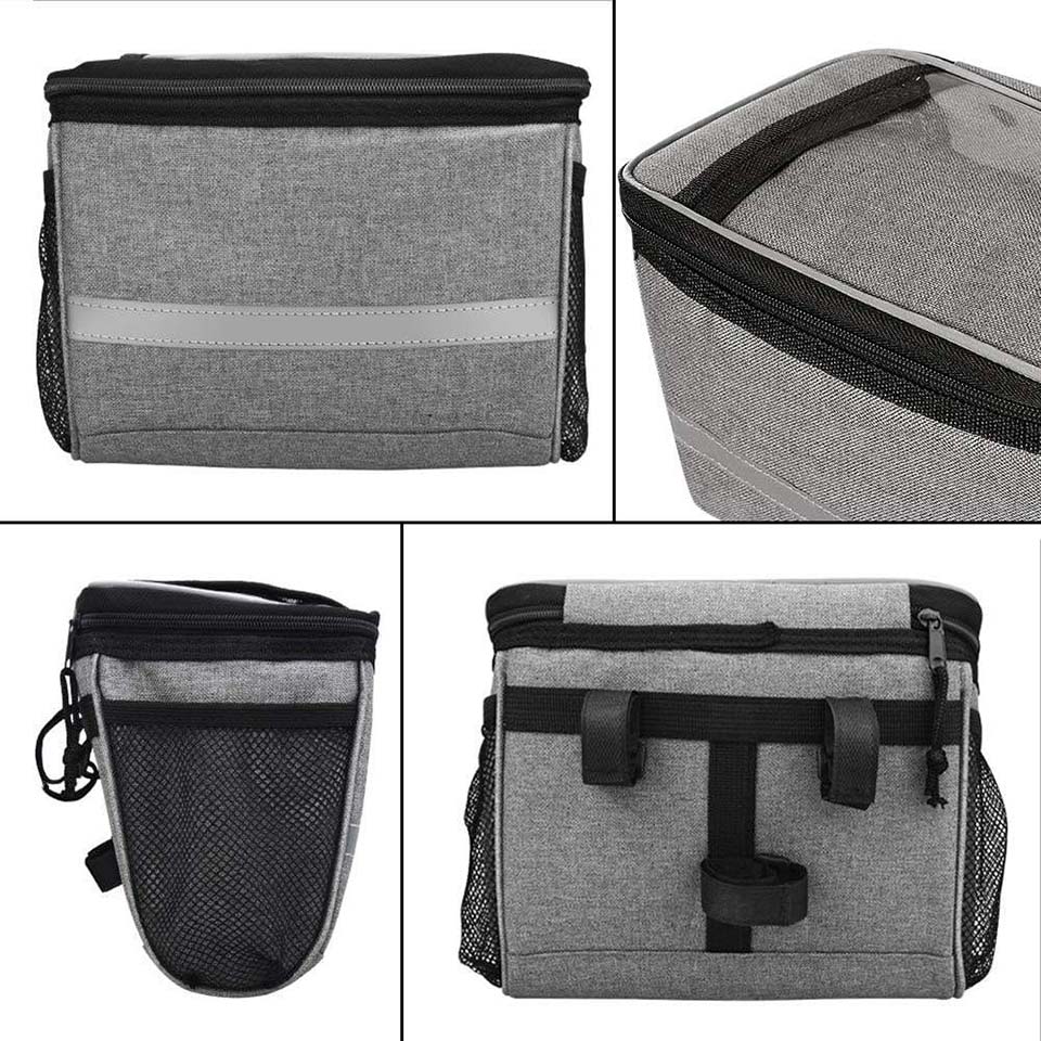 bike storage pack. It can achieve the effect of heat and ice preservation, keep your lunch and drinks cold for 1/2 a day with ice pack, or keep them warm for hours. * Touch Screen Phone Window --- Designed with transparent TPU touch screen on the top, waterproof and high sensitivity, makes it easy to use phone without taking out. The clear large pouch with dimension of 7.5x5.5 inch (LxW), fit for all model of smart phone, GPS or maps. * Large Capacity --- Big capacity up to 2.75 L enough for essentials like small snacks, lunch, drinks and cell phone, keys, as well as bike accessories like bike repair tool, spare tires and folding bike locks. Both side mesh pockets can easily fit a can or plastic bottle. * Durable Material --- Adopted 600D Oxford material, which is lightweight but sturdy, the bike handlebar bag was made to last. The wide stripe on the front is reflective, keep bikers be visible in dark and ensure a safe night riding. * Strap On Install --- 3 hook and loop fastener install strap, help to fix the basket bag on bike in seconds and without moving around when riding. Suitable for most of mountain and road bike, as well as commuting Ebikes and scooters. |