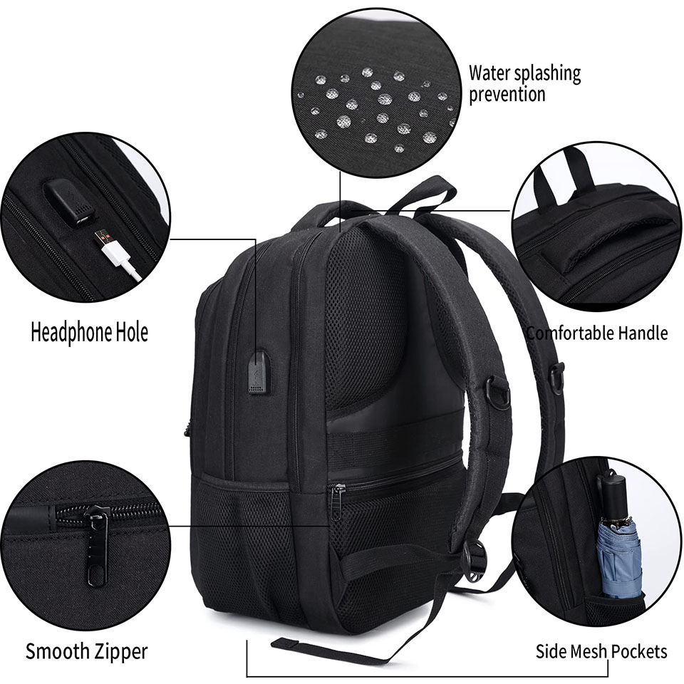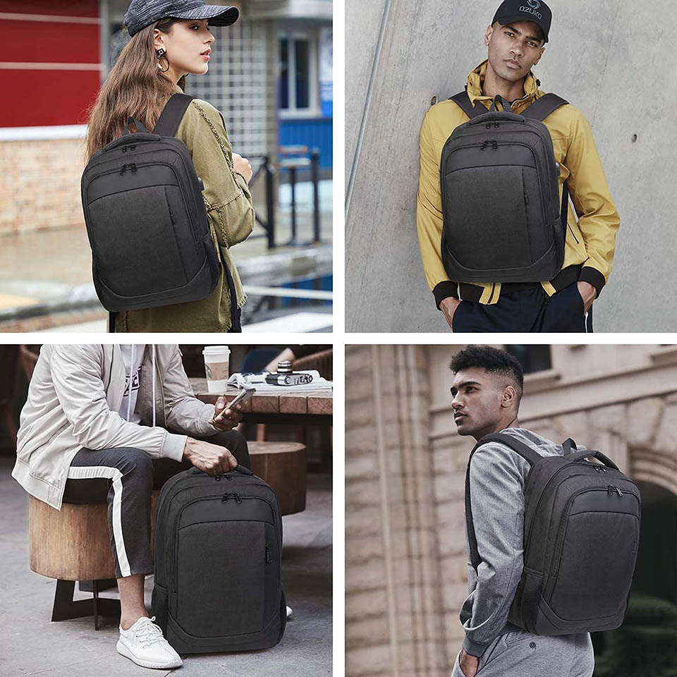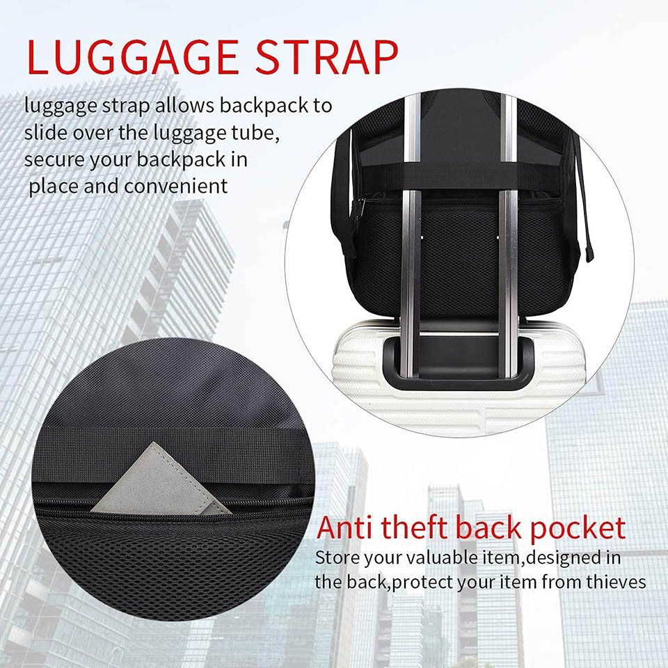 HIGH-QUALITY MATERIAL: Our backpack is made of waterproof and quality Polyester fabric with metal zippers. Lightweight and sturdy, ensure secure & long-lasting usage every day. Perfect for weekend getaways, shopping, office work, business traveling, and other outdoor activities. Also, it is a perfect travel laptop backpack for women and men. ANTI-THEFT&FUNCTIONAL: The backpack back luggage strap allows the travel laptop bag to fit on the suitcase, and slide over the luggage upright handle tube for easier carrying. A small anti-theft pocket located on the lower back keeps your phone, wallet, passport, and other valuable items safe and handy. The internal shockproof belt is for fastening your laptop and iPad, preventing them from sliding and bumping. CONVENIENT USB PORT DESIGN: With a built-in USB charger outside and built-in charging cable inside, great convenience for charging your electronic items via connecting your power bank, and offers you a more convenient way to charge your phone while walking. Please note that this backpack doesn't power itself, usb charging port only offers easy access to charge. COMFY & BREATHABLE BACKPACK: Adjustable shoulder straps and back side come with a comfortable and breathable mesh design, relieving the stress of your shoulder. A comfortable airflow foam-pad back design with soft, multi-panel breathable mesh padding, offers your back maximum back support. A foam-padded top handle for a long time carries on. |
