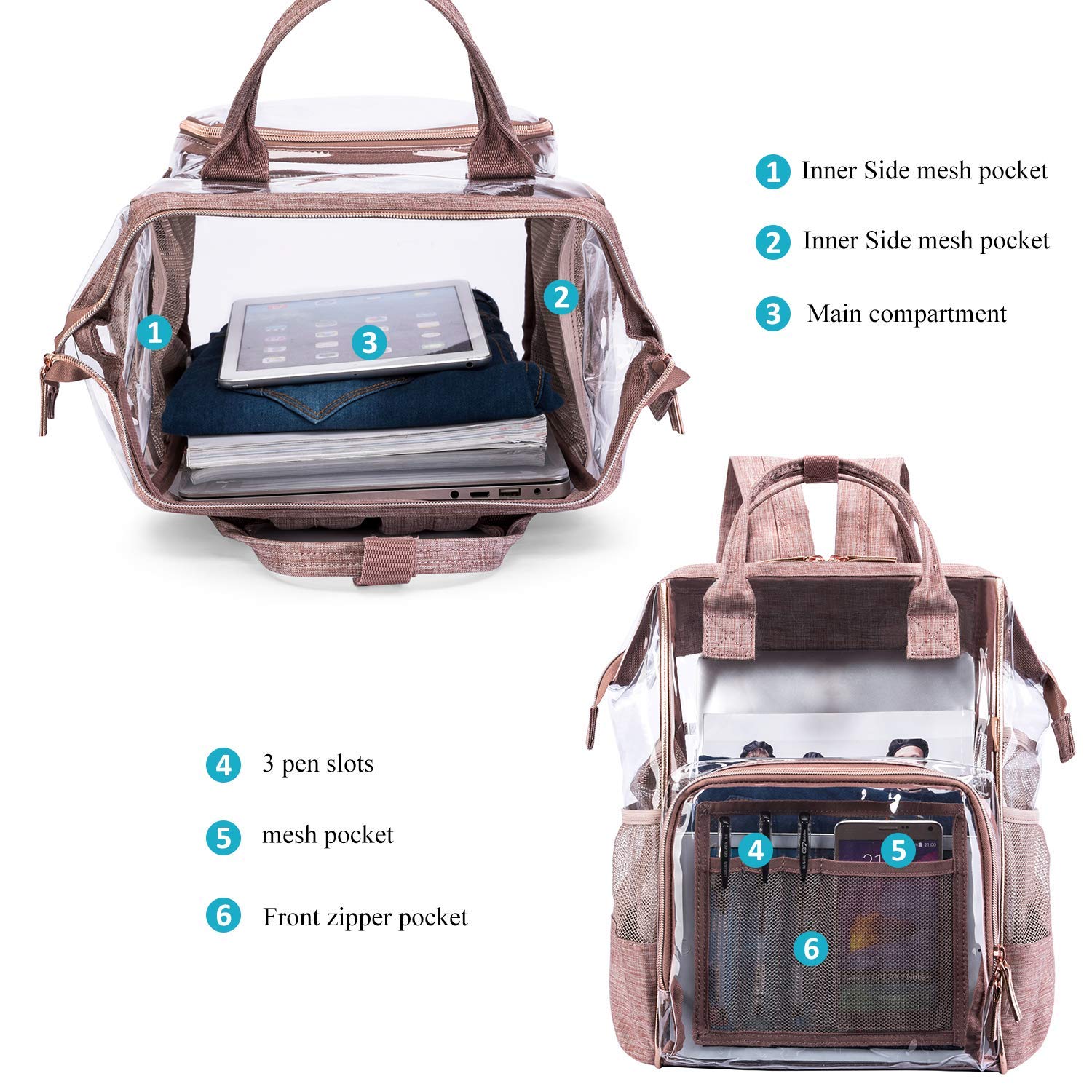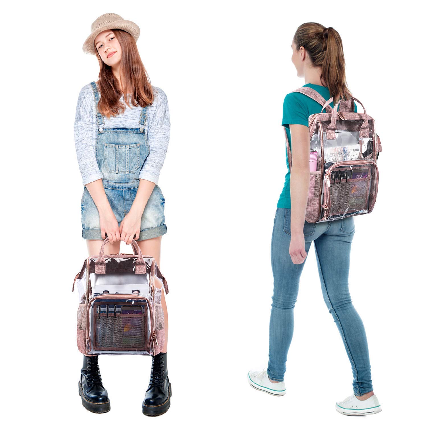 Made of Eco-Friendly PVC material 1 x Clear backpack fit up 15.6 inch laptop: 16.5" x 6" x 12"; 1 x Large clear bag with leather handle: 9.5" x 4.8" x 7"; 1 x Small clear bag: 6.3" x 2" x 5.2"; 1 x Large leather bag: 9" x 2.3" x 6.5"; 1 x Medium leather bag: 8.3" x 2.7" x 4"; 1 x Small leather bag:7.5" x 3" x 3.5".Great size and enough space to pack different type of travel/school accessory.