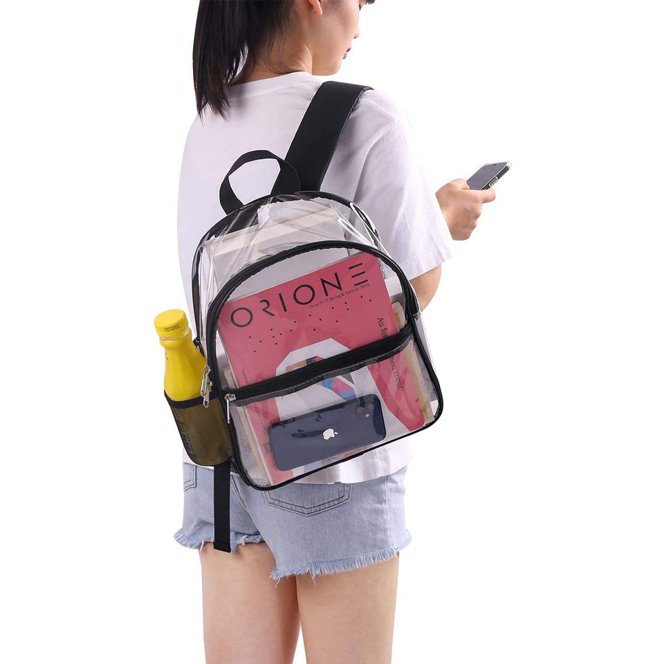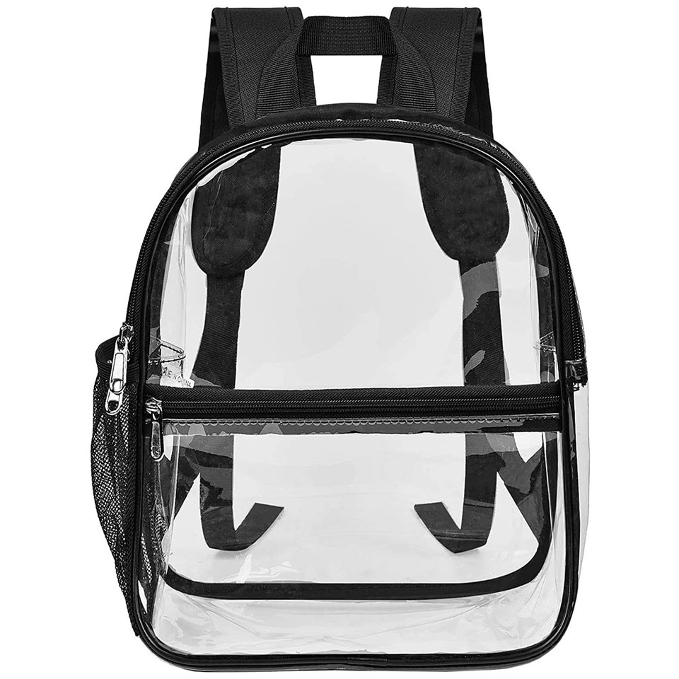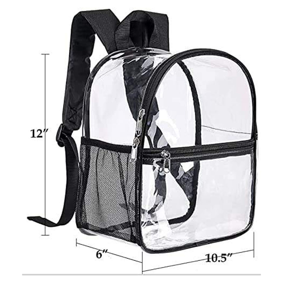 through all around, including back and bottom. Which is perfect for travel, security, stadium sports and much more! * 【 Stadium Approved Size 】- The size of main dual zippered compartment is 12"Hx11"Lx6"W. see through backpack is suitable for sport event, traveling and work. The front pocket is ideal for snacks and includes extra pockets for pencils and other travel necessities. * 【 Stylish and Comfortable Design 】- The reinforced padded adjustable straps add to the soft-comfort for all day wear. The top handle is perfect for when you want to carry your bag and give your shoulders a break. * 【 Reinforced Stitching 】- Stitches around bottom and each corner are reinforced. Anti-tear and Durable for daily use. * 【 Security Checks 】- Completely transparent all around, including back and bottom—great for seeing inside and quickly finding what you need. |