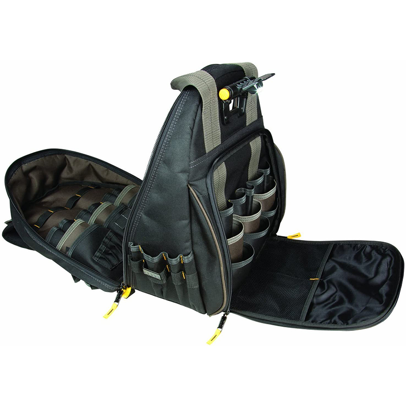 BUILT-IN LED LIGHT: The built in LED light on this lighted tool backpack can be easily directed at work area or into tool carrier to help identify tools and parts. 3 Levels of light output allow adjustment for wide area illumination or close-up work.