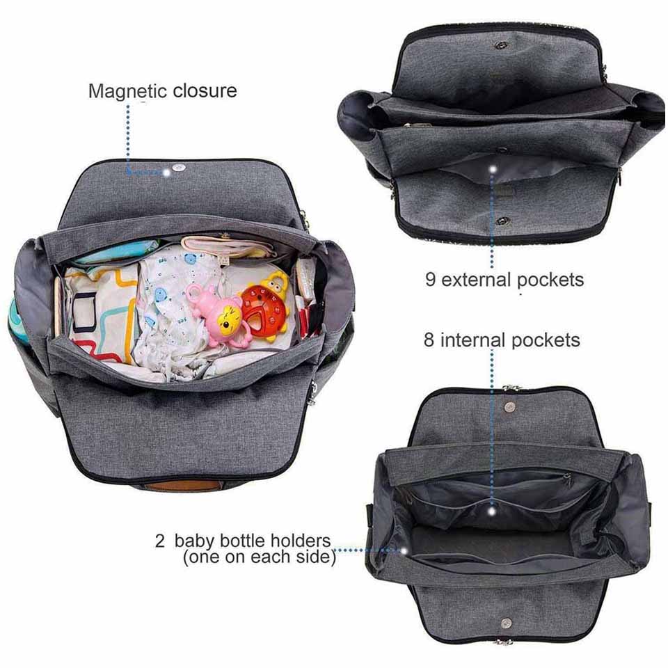 Diaper bag with 1 main pocket and 14 compartments to store everything you'll need for your little one inside, the best part about it is that it's waterproof, easy to clean, durable and lightweight. It will work great for a toddler bag and newborn diaper bag.