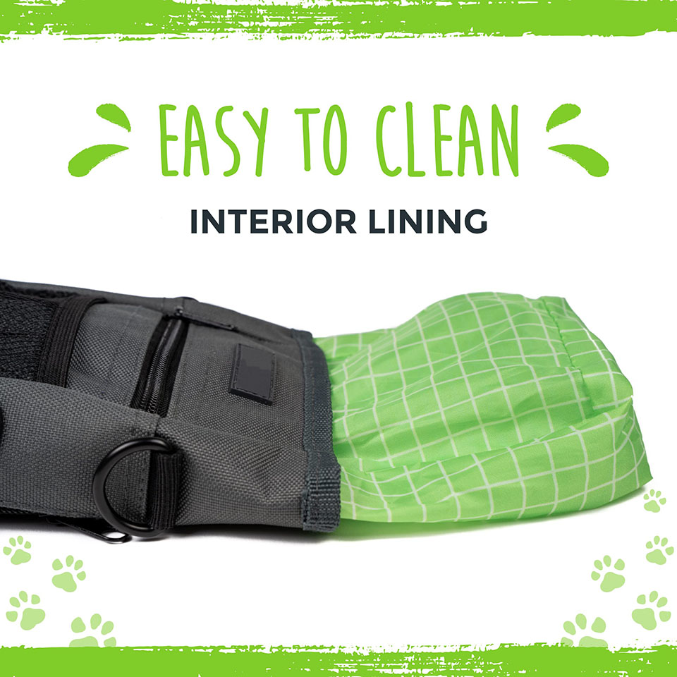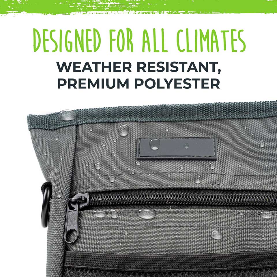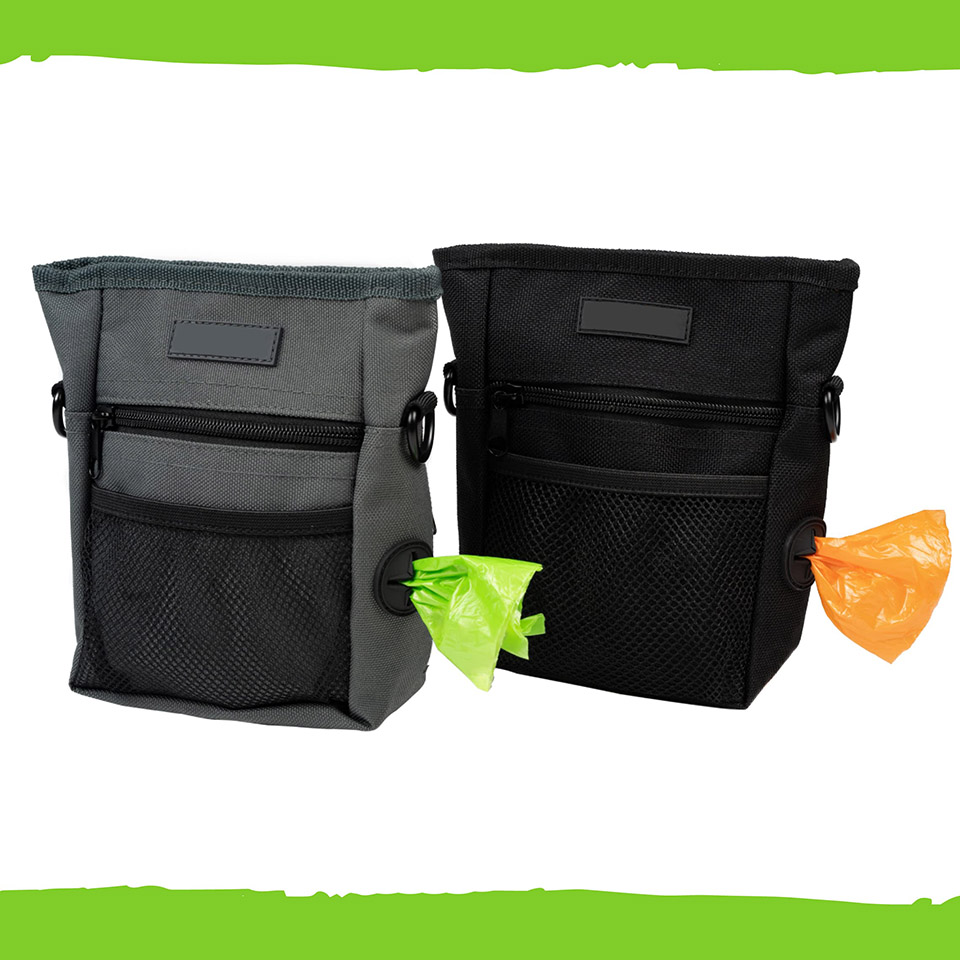 Fits Everything You Need!: This 7" x 2.5" x 5" treat pouch has 4 storage solutions! The main compartment holds two cups of treats or kibbles so you never run out of food rewards. Use the strong mesh pocket and the zippered pouch on the front of the bag to store your phone, wallet, and/or keys. Thanks to our integrated poop bag holder on the side of the bag, you never find yourself in a poopy situation! We’re even hooking you up with a roll of poop bags - on us! Ultimate Versatility: We designed our treat pouch with a multipurpose belt sling and a metal clip. You can wear it 4 different ways: Over the shoulder or across your body using the shoulder strap that adjusts from 30”-52”, around your waist by looping the adjustable belt sling onto the 2 attachment points, or on your belt or pants by attaching the metal clip accordingly. Quick Access Without The Spills: No more fumbling with drawstrings! The Dog Treat Pouch features two strong magnets inside the main treat compartment. This magnetic closure allows you to quickly access your pup’s treats and cinches closed right after to prevent any spilling and curious doggie noses from taking over the bag! Easy to Clean, Stylish & Safe: Our treat bag is made of stylish quality, weatherproof polyester and interior lining which makes it super easy to clean. That means you can use it rain or shine!