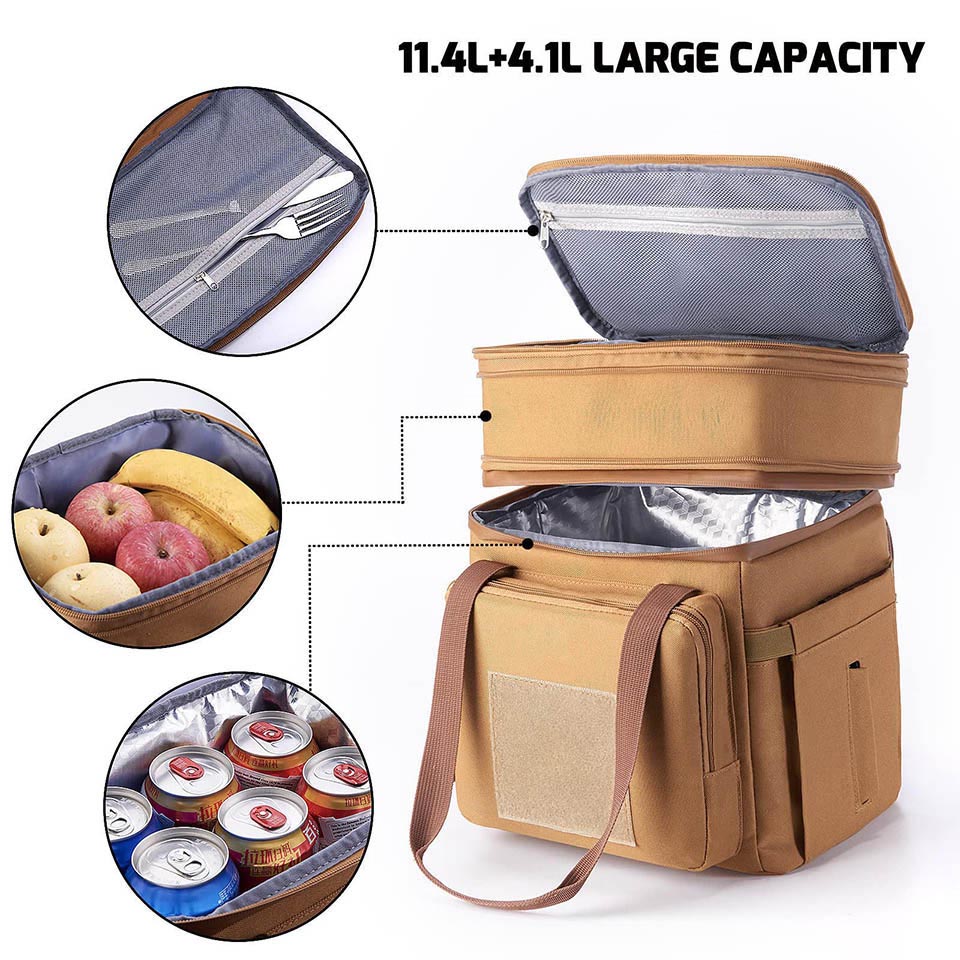 * Military fans' favorites & Large capacity can hold all your meals! Tactical lunch box for men (10.5 * 7.5 * 13 inches), Separation of wet and dry, upper compartment 4.1L, bottom compartment 11.4L, suitable for all kinds of meal prep containers, bento, or 12 cans of soda (12 Fl. Oz), the sides and front pockets also have enough space for water bottles, tissues, meds, and other stuff, the upper mesh pocket can also hold your utensils.