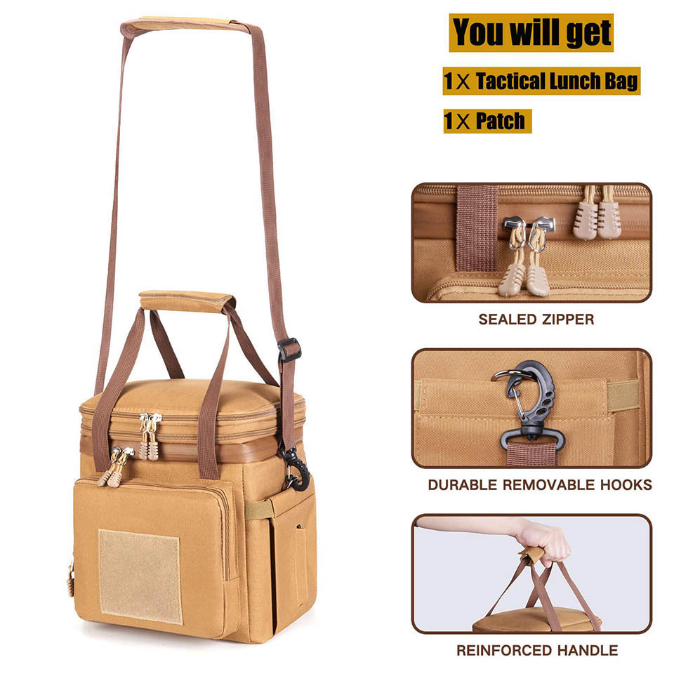 * Extra durable military material! The lunch box outer layer is made of 900D PVC heavy-duty waterproof Oxford cloth, the middle is made of high-quality EPE foam, and thickened aluminum lining with the hot pressing process, which is leak-proof and easy to clean to ensure good heat insulation in any weather and keep food cold, warm and fresh for a long time. You can put the ice packs in the insulation cooler bag to keep the best cold effect. * Very cool-looking and functional design! Classic military style/tactical cooler, includes rear MOLLE webbing for extra storage/attachments, The top of the front pocket is for tapping patches, sturdy zipper with ropes and sealed zipper on the main compartment, reinforced handle, and removable adjustable soft padded shoulder strap, easy to carry, it's also the perfect gift for a man, dad, husband, son or boyfriend! |
