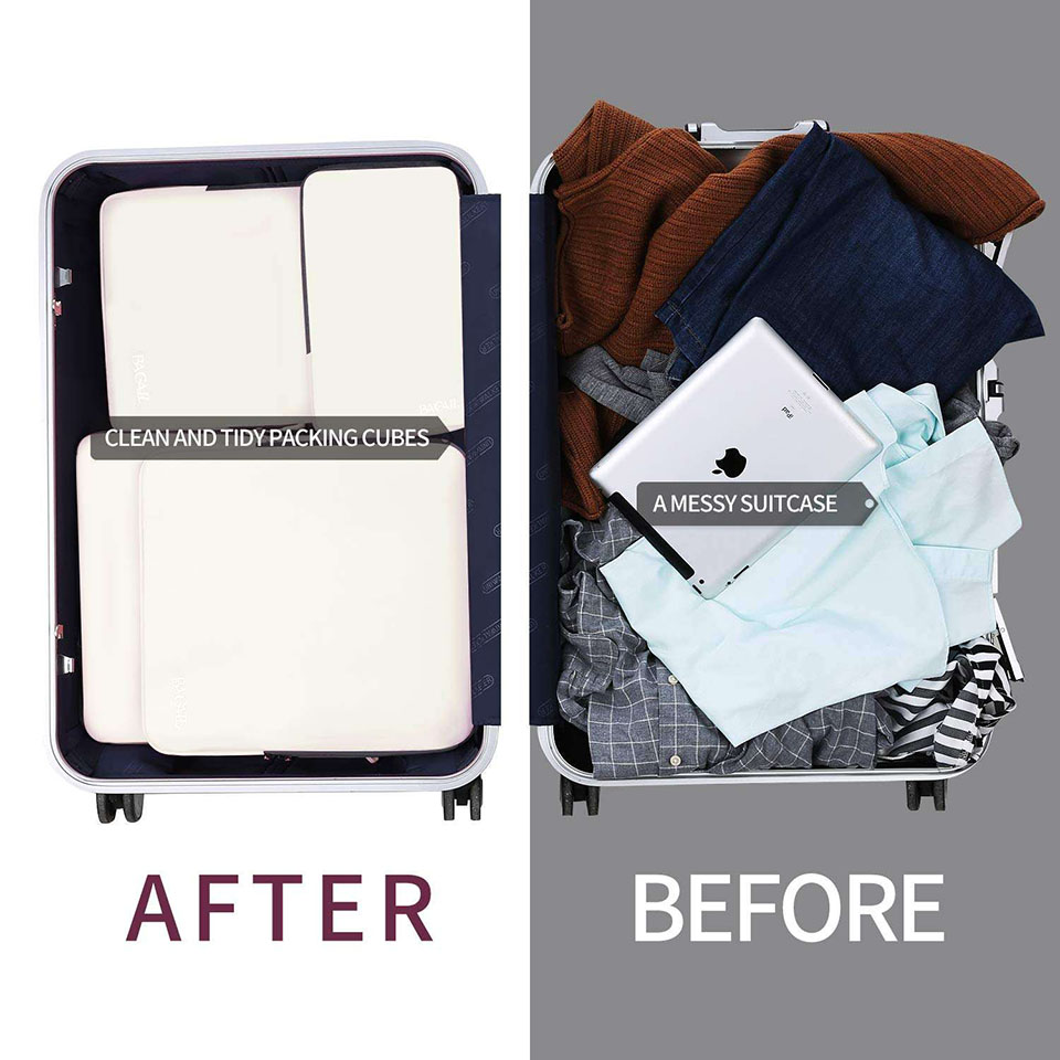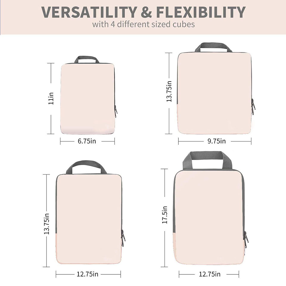 * ITEMS INCLUDED:This Set Of Packing Cubes Includes One Xl(17.5 In X 12.75 X 4in),One L Size(13.75" X 12.75" X 4"),One M Size(13.75 X 9.75 X 4), One S Size(11" X 6.75" X 4") * SPACE SAVING by COMPRESSION:Save Up to 60% Space by Compressing the Packing Cubes via the Exterior Compression Zippers. You just need to : 1) Fold Your Clothes and Flatten Them to Pile One by One Neatly 2)Pack the Neat Clothes in the Packing Cubes and Zip the Normal Zipper. 3)Put a Finger on the Back of the Zipper in the Space When Compressing the Packing Cubes in Case the Zipper Get Stuck in Fabric. * PREMIUM UPGRADED NYLON FABRIC:Smooth&Soft Nylon Fabric Protects Your Clothes from Wrinkles and Stains.High Performance Feature Makes Sure this Packing Cubes can Bear High Density Wear and Tear during Traveling.Water-Repellent Feature Nicely Protect Your Clothes from Spill or Leaks.Easily Store Your Clothes and Protect Your Clothes from Stains and Wrinkles * LIGHTWEIGHT&DURABLE:Super Light Nylon Fabric and Considerate Designed Construction Ensures Storing Your Clothes Neatly in Luggage without Adding Extra Weight.Premium Sturdy&Smooth Double Way Zipper with Extended Cord Ensure Fast&Easy Opening and Closing of the Packing Cubes. * VERSATILE and MULTI-FUNCTIONAL :Different Sizes Packing Cubes for Different Packing Purposes.Separating Your Clothes,Such as Jackets,Sweaters,Underwears,Socks into Different Packing Cubes for Easy Access. |
