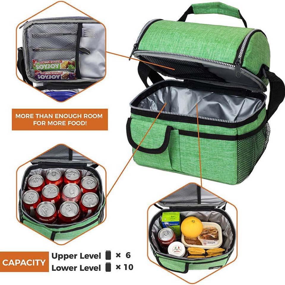 And if that's not enough, the top compartment has enough space to carry another container of food or 3 standard size water bottles! * SEPARATE HOT AND COLD FOOD This lunch bag offers different ways of packing your food. Its 2 isolated compartments allow you to separate hot and cold food/beverages, and two-sided zipper design makes for easy and convenient access. With this extra space,it is also great for ice packs and ice blocks to keep your food extra fresh. * DURABLE AND RIP RESISTANT Made with high-quality nylon and 600D polyester fabric with reinforced zippers to prevent rips and ensure maximum durability. * MULTI-USE & CONVENIENT: Great for men and women to pack food and drinks for work, school, picnics, beach, road trips, camping, traveling or any outdoor activities. Comes with an adjustable shoulder strap and top handle to easily carry around, and two side mesh pockets for water bottle storage. Our reusable lunch pail is perfect to preserve freshness for those on the go. |