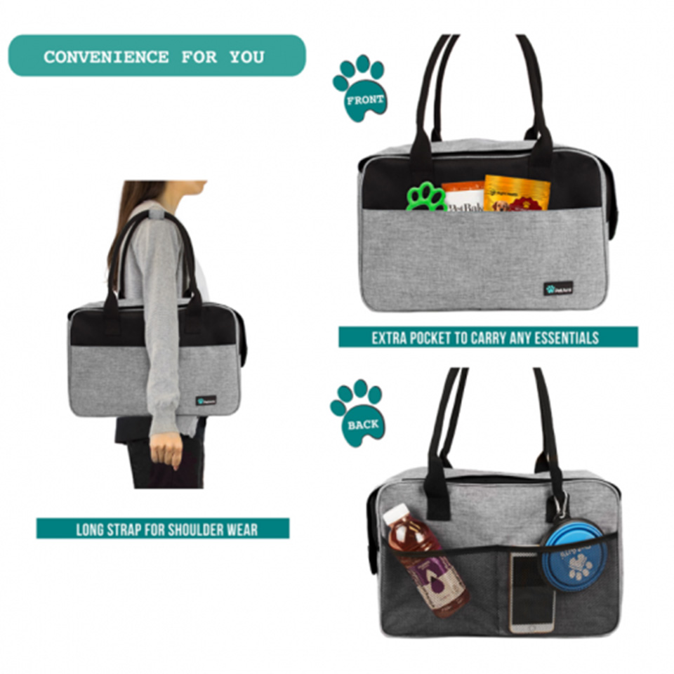 This pet carrier provides two connecting loop handles for balanced carrying as a dual seat belt or luggage strap to secure transport.And it is easy to carry and store, which has a padded shoulder strap and handles.