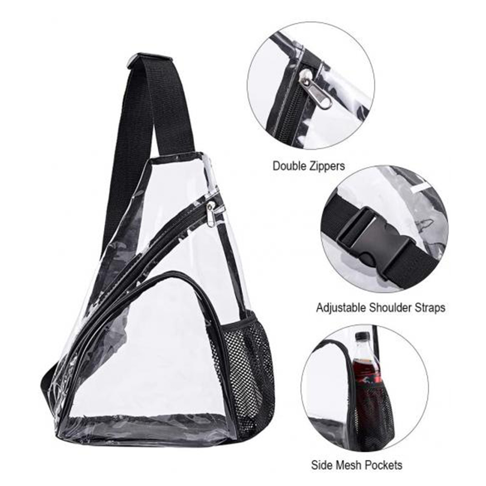 * Lightweight Durable Design:Clear sling bag made of heavy duty Clear PVC waterproof material with top-quality zippers and durable strap clip. Comply with cold-resistant CP65, no harmful chemicals.Which is perfect for schools, security, stadium sports and much more.
