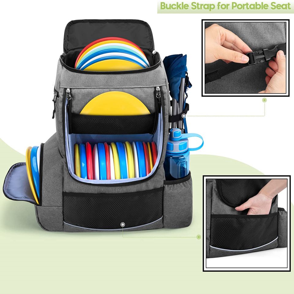 * ORGANIZED STORAGE SPACE: The disc golf bag backpack features two bottle holders and a phone pocket with USB, putter pocket can fit 1 putter and additional pockets can hold your accessories. An exterior strap to tie down large items, such as a portable seat.