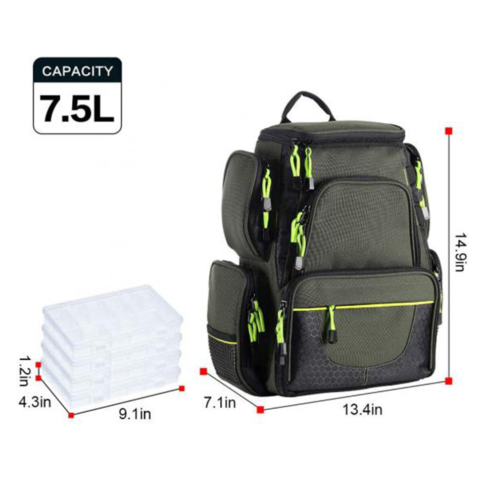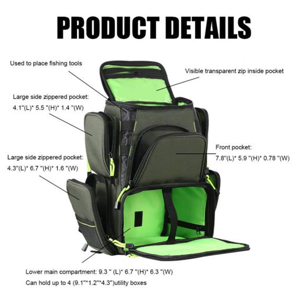 Product name:Fishing Tackle Backpack Color:Crocodile Green Usage:Tool Packaging Size:17 x 11 x 6.5 inches