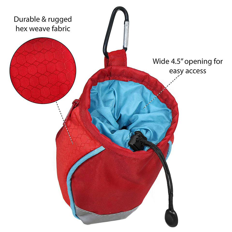 * Wide mouth opening & drawstring closure: pet treat bag has a wide opening for easy and quick reach to dog treats drawstring closure secures treats fast and keeps them fresh for your pup * Zippered pocket for storage: training pouch features side zippered pocket for storage purposes zipper pocket can hold Poop bags, keys, headphones, ID, or cash * Reflective material for nighttime visibility: keep yourself safe, visible when it’s dark outside with the reflective trimming on treat bag |