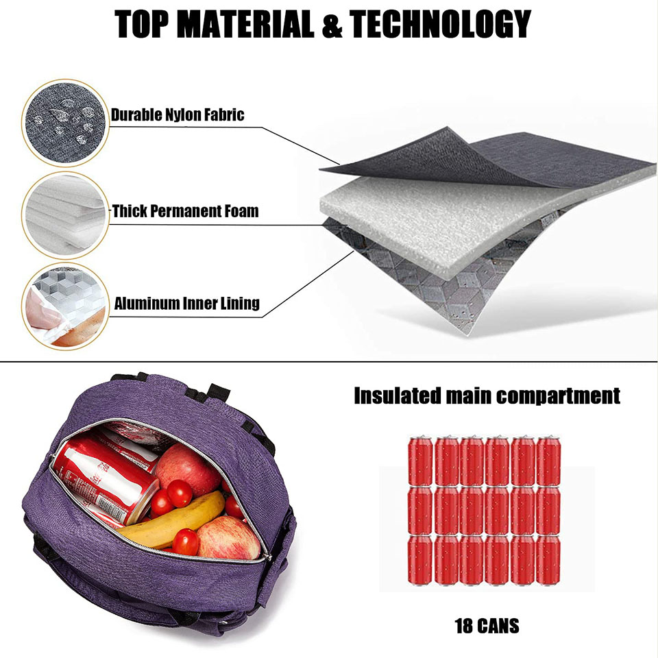 COOLING PERFORMANCE: Guarantee 16 hours at temperature below 15ºC with freeze packs (The duration will vary according to the environment temperature) LEAKPROOF: Thick layer of food-grade PEVA insulation materials inside to ensure the frozen things don't leak after melting LARGE CAPACITY & OPENING: Dimension: 43 x 31 x 17cm; Weight: 620g; About 22L, can hold at least 24 cans. Large opening makes you easy to access COMFORTABLE & PORTABLE: The breathable shoulder straps are very comfy to wear on your shoulders and back. Design with handles, can also be carried by hand. SUGGESTIONS: Don't put the ice directly into the rucksack to avoid cutting off the leak-proof material inside. We can use the freeze packs to keep everything cool all day. Good for beach trips, picnics, camping, hiking, swimming, etc.