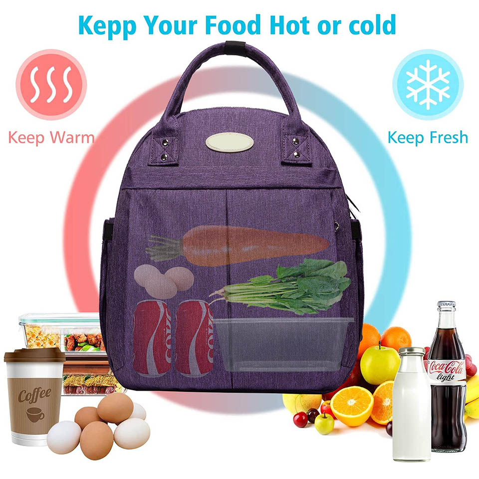 The top of the bag is made of PEVA material, for keeping your food fresh, suitable for fruits, snacks,drinks, etc The bottom of the bag is made of aluminum foil, for keeping your food warm, different temperatures can maintain 4-8 hours of insulation Size of lunch bag: 24 x 20 x14.5cm, the top of bag:20 x 14 x13cm, the bottom of bag:20 x 15 x 9cm , The length of shoulder strap is adjustable(MIN:29cm, MAX:55cm) The bag is convenient to carry to school, work, picnic, camping,fishing trip etc. Several pockets on front and back for something needed,like phone,tableware, transportation card,earphone,etc Made of high quality and strong oxford cloth, the bag is suitable for hand wash in cold water, NOTE:don't wash in hot water or machine wash