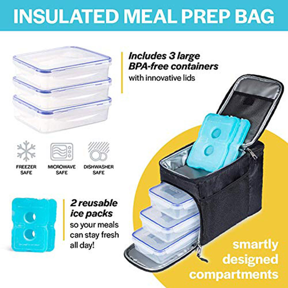 1.You get 3 Portion Control Containers - Enough containers to get you started on the road to achieving your goal with meal prep. 2.You get 4 Massive Insulated Compartments - A Heap of room to put all your containers inside, plus room for 2+ shakes and fruits,nut,vitamins and anything else you can think off. 3.All Containers and are BPA Free, dishwasher, microwave and freezer safe. - This mean you get put these containers anywhere you like and they are going to stand up to the test of time. 4.Has a Handle and Shoulder strap.