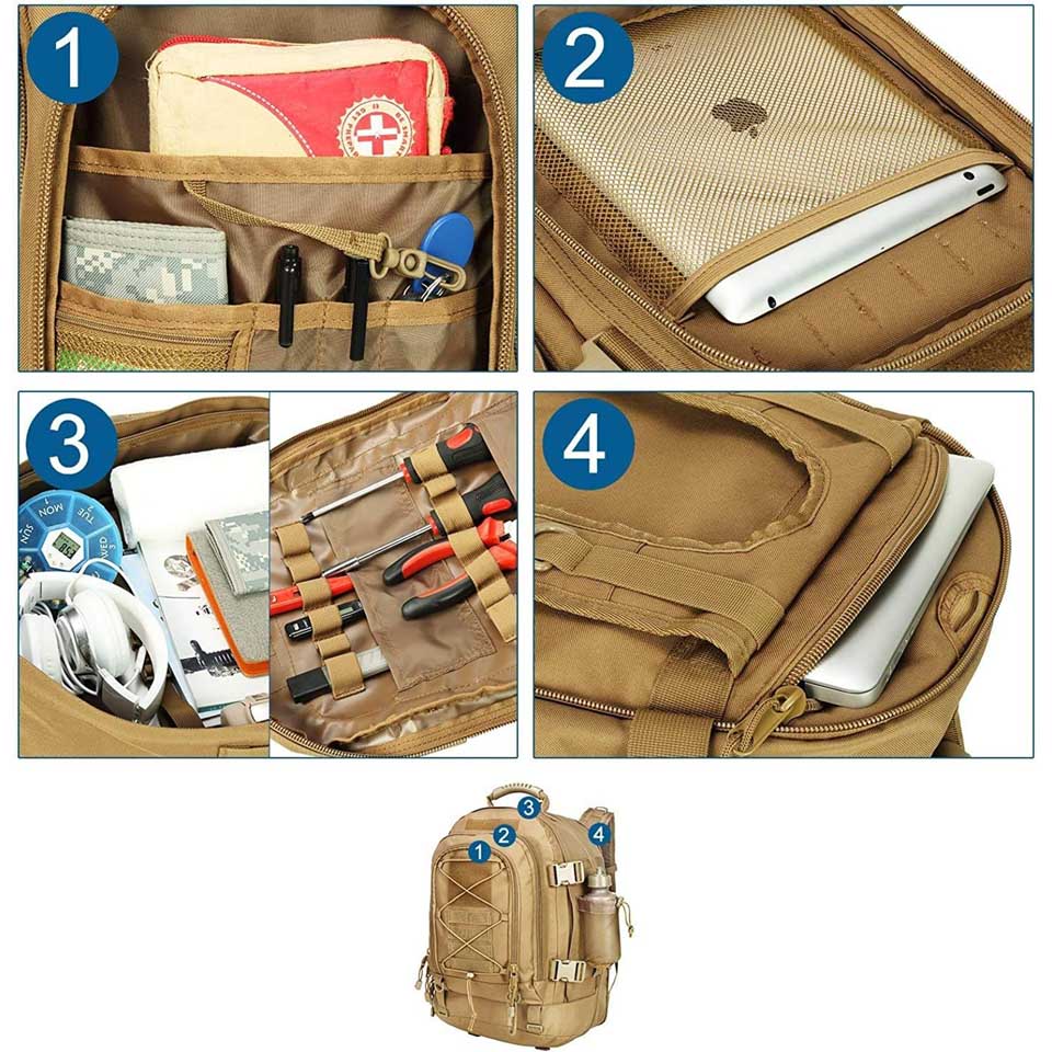 * Zipper closure * ✅ You can use this backpack every day for school, carry on for travel or a military tactical assault rucksack. It is completely versatile for any backpack situation. You will love having so many different places to put all your stuff to keep it all separated. It even has a hydration compartment. * ✅ There's plenty of compartments to store and organize your life. The pack holds 3 days worth of clothes along with toiletries and other essential gear. A solid multifunctional backpack for combat, range, survival or hunting. It is water resistant keeping everything dry in a storm. * ✅ A great advantage is the accordion zipper or expandability so you can shrink it down to a smaller bag when you don't need the extra room or expand it to 5 inches deeper for more gear. You will be so impressed with our backpack. You can make it into a bug out bag or 72-hour emergency kit and just the greatest travelers Christmas gift. * ✅ With its 600 denier polyester making it tear resistant with awesome straps and great zippers. One nice surprise is the waist strap is removable for when you are not hiking, camping and trekking. It will easily handle 40lbs internally. At 14.5" x 21" x 8" with a capacity of 39 to the expanded 64 liters and only weighs 3.6 pounds. |