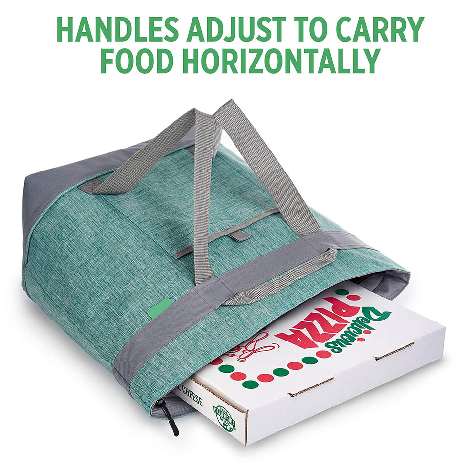 Extra Feature – Handles conveniently adjust to transport items horizontally – great for pizzas and casseroles! extra strong webbing belt handles. Heavy-duty construction easily supports 40+ lbs. CONVENIENT – Flexible fabric sides accommodate odd-shaped items. Long hands loop over your shoulder and