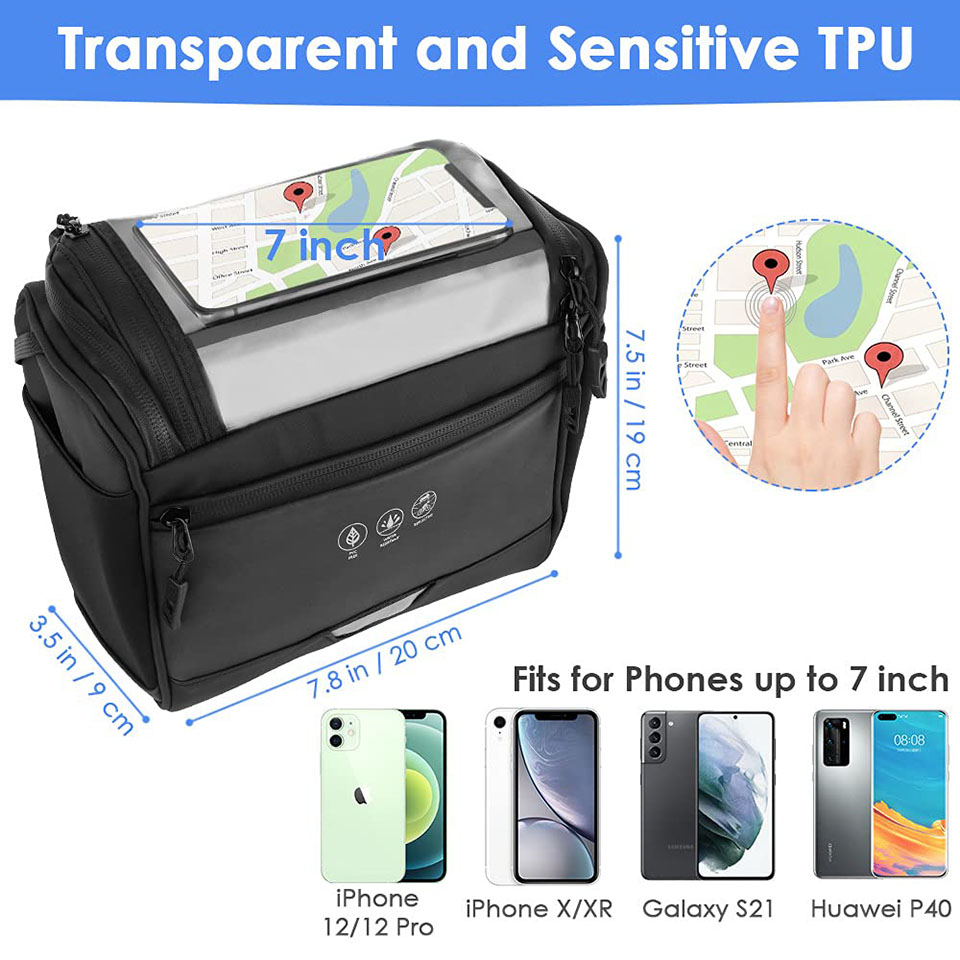 * 【3.5L Large Capacity】 --- Besides the 3.5L main pocket, there are two water bottle pouches on both sides of the bicycle handlebar bag, as well as 4 inner compartments and a zipper pouch inside, which help to collect small items like credit cards. Our bike pocket is big enough for bike repair tool kits, mini pumps, keys and etc. * 【Water-Resistant 600D Oxford Cloth】 --- WOTOW bike front frame bag is made of 600D Oxford cloth and coated with superb PU film, water-resistant and durable but lightweight and simple to use. The customized rainproof zipper prevents rainwater from entering the bag and protects your items from being wet. * 【Sensitive Touch Screen】 --- On the top of the bicycle basket bag , there is a large transparent TPU waterproof window with a dimension of 7 x 5 inches, fit for all kinds of cellphones up to 7inch. The clear high sensitive TPU makes it easy to slide unlock to answer phone calls and use the navigation while riding. * 【Customizable Installation】 --- On the back of the bike accessories bag are many install loops, which were designed for different bike installation positions by using the removable fastener. It can be used for road bikes, mountain bikes and motorcycles. It come with a detachable shoulder strap, which can be carried on the body as a cross-body bag. |