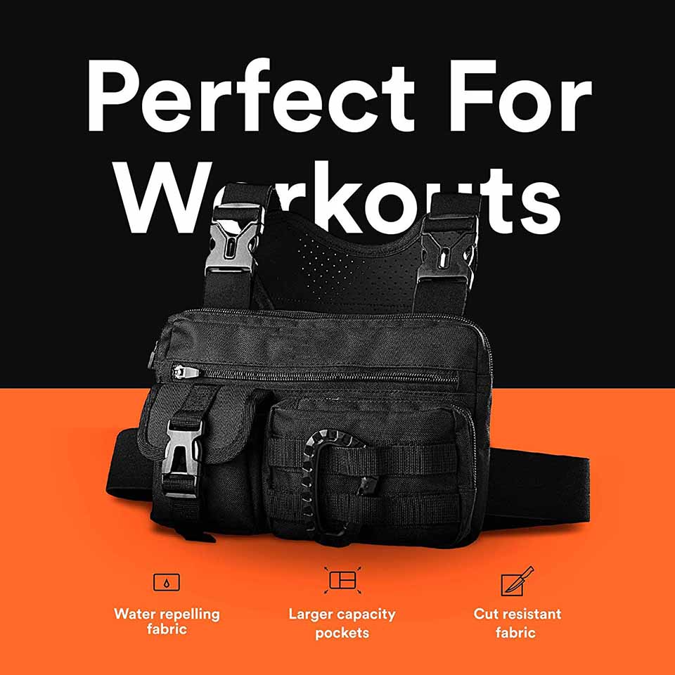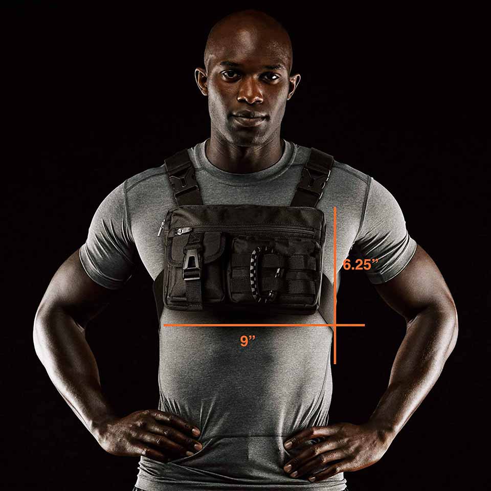 * FINALLY a CHEST PACK with PORTABILITY and COMFORT - Measured at 9 inch x 6.25 inch x 2 inch, it is a sports utility pack that can hold more items than a fanny pack and is easier to carry than an armband. A new way to keep your phone, earbuds, wallet and