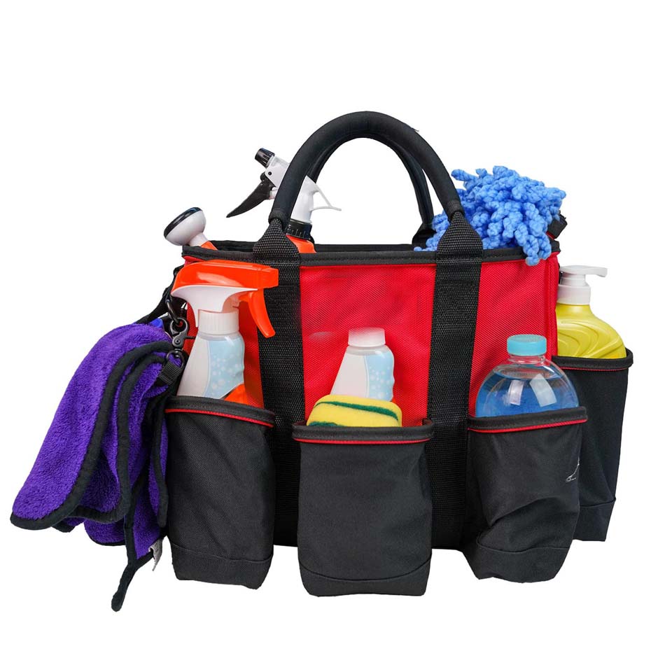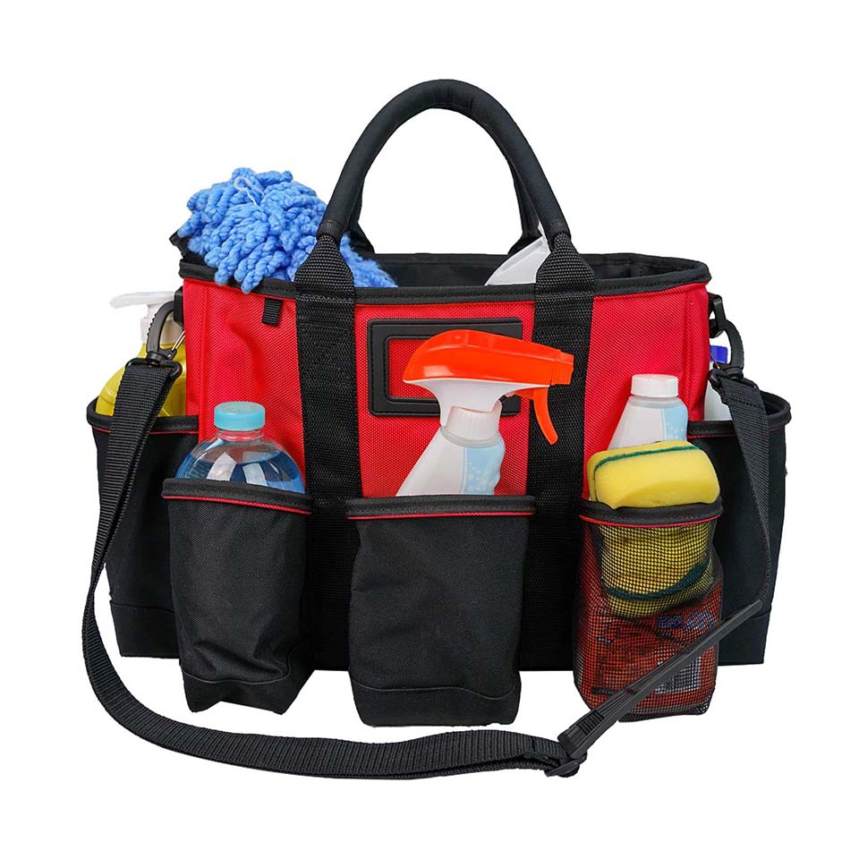 * Sturdy Tool Bag: 1680D water resistant bllasic material; your tools will be well taken care of in this wide mouth tool bag* Multiple compartments with 15 pockets: includes 8 external pockets and 7 internal pockets * Cleaning Provider Tool Bag - With shoulder strap and padded handles for comfort. Strap handles have sewn-in padding on the grip * Plastic Base: There is plastic base at the bottom to protect the bag gusset from getting wet |