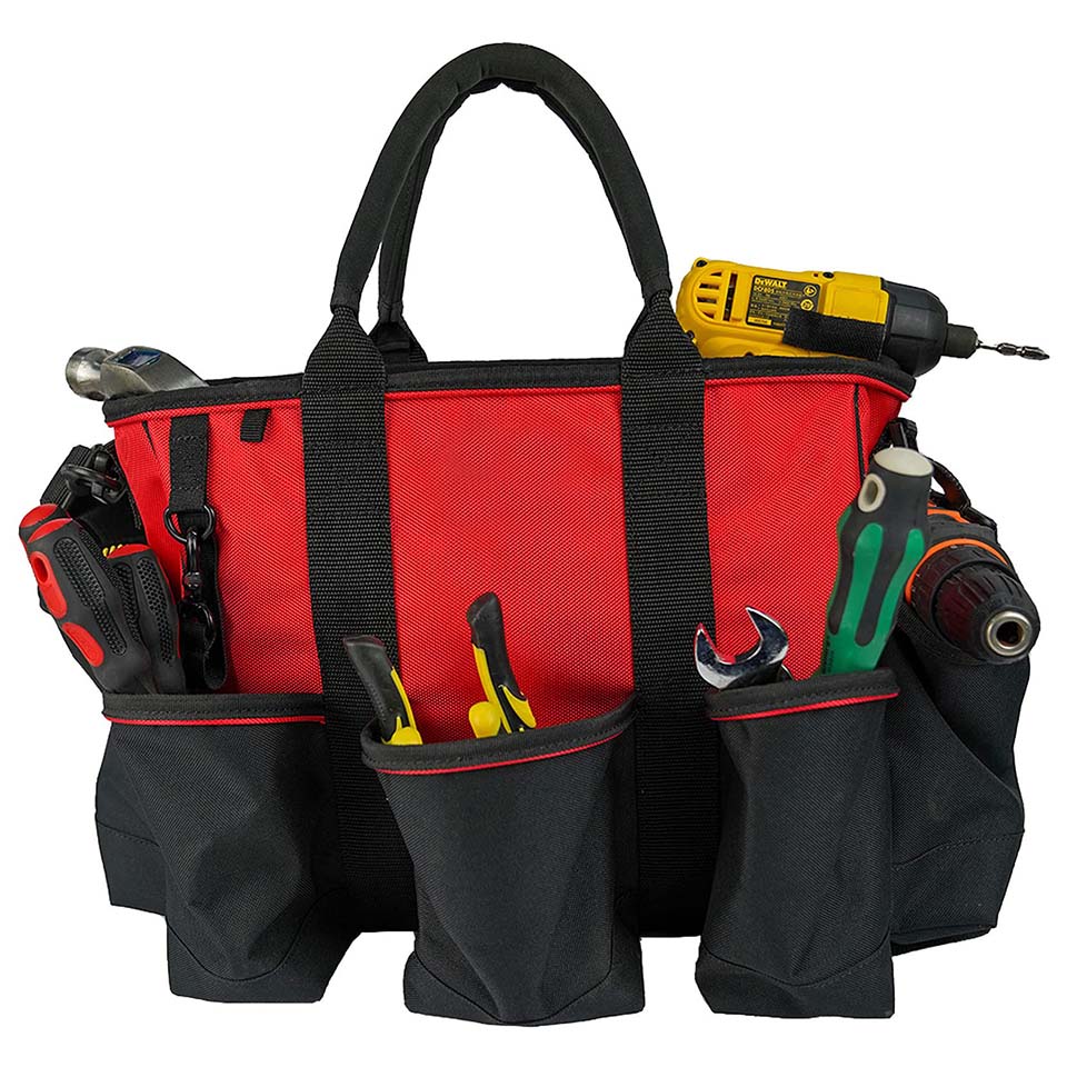Durable tool bag with large, zippered main compartment, 17 exterior pockets and 10 interior pockets