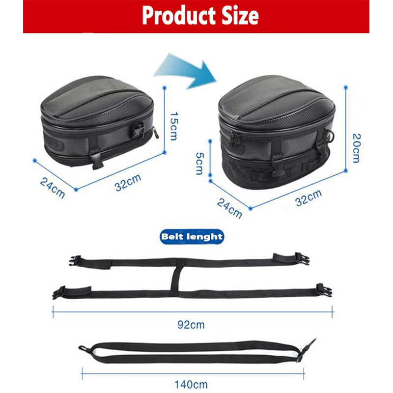 • [PACKAGE INCLUDED]: 1 x Motorcycle Tail Bag; 1 x Rain cover; 2 x Buckle strap. Only 0.64KG,Perfectly sized for light traveling