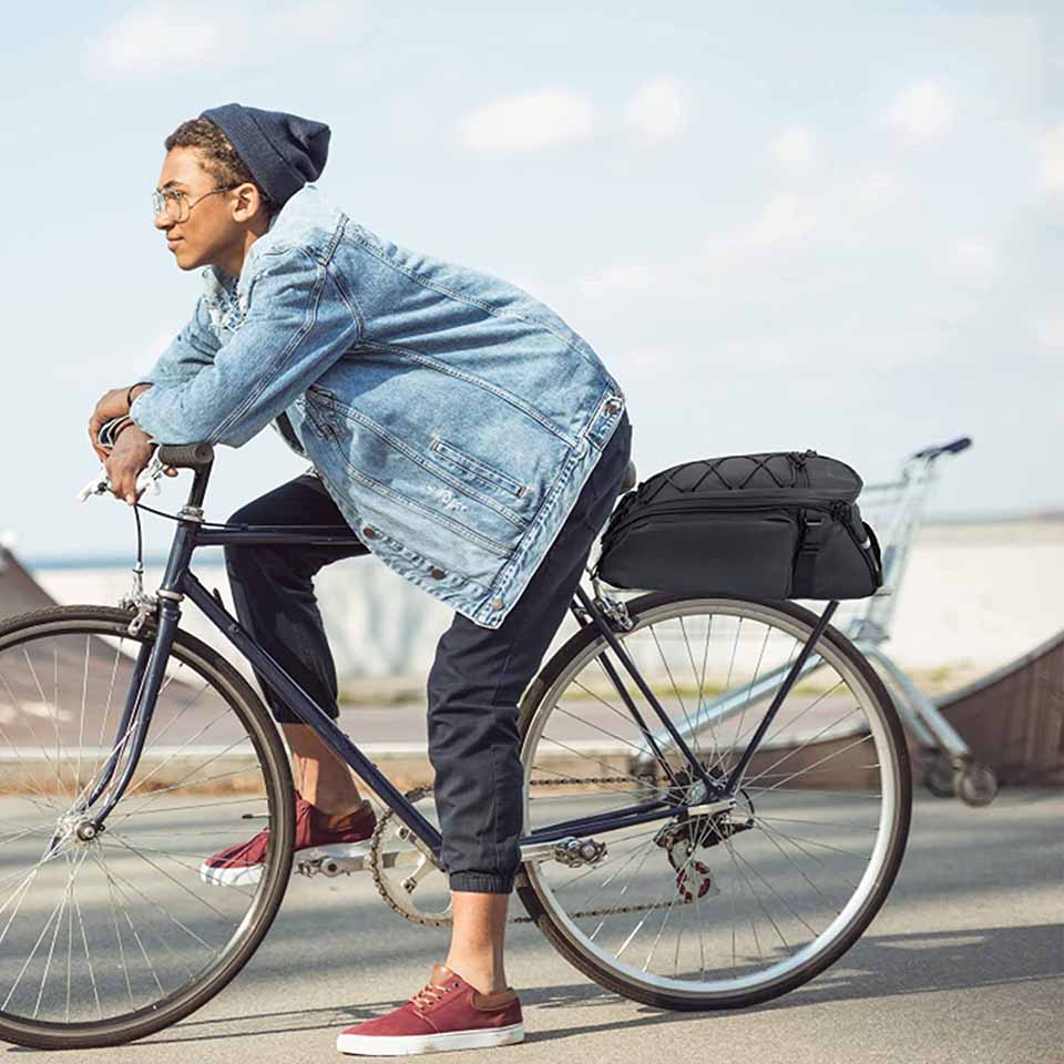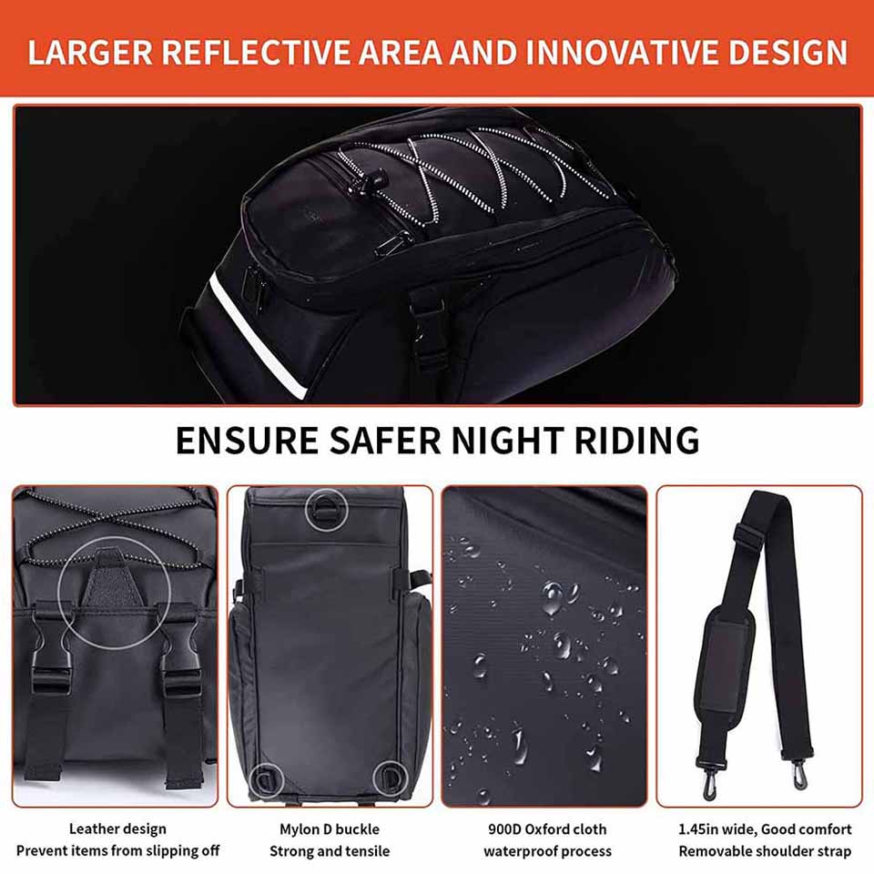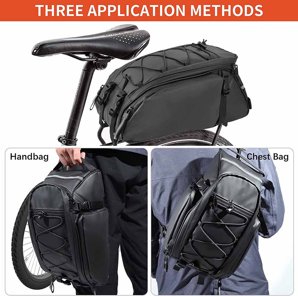 * MATERIAL: This bike rear rack bag with 900D Oxford, cloth surface coating PU makes it easy to clean. A thickened PU waterproof zipper was also used to prevent rainwater penetration.