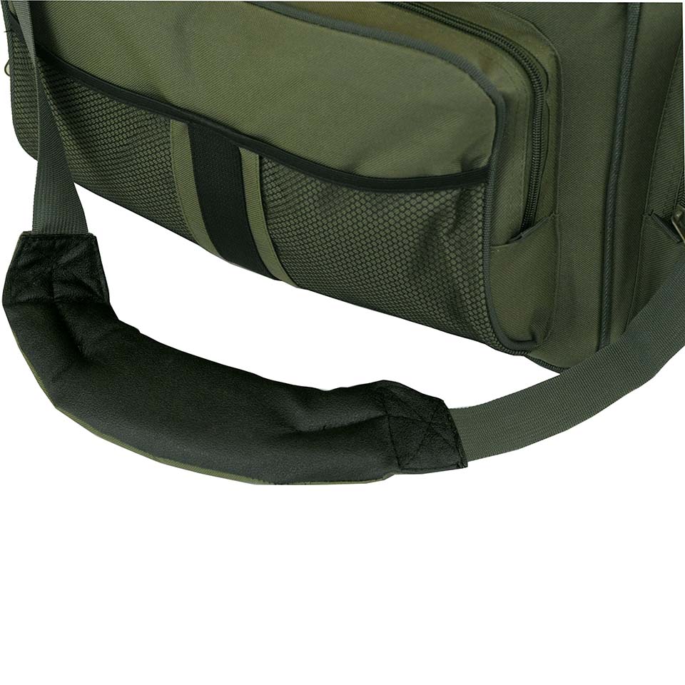 The main fully padded compartment is very large, giving you plenty of room for your bait, reel, and other hosts. It has thick insulated padding, which also helps the bag maintain its shape (meaning this tote can double as a cooler bag), and it also has a waterproof lining. Both the main pocket and the bag are equipped with high-quality reinforced zippers to ensure they have the reliability you need. There are two carry handles and an extra-thickly padded shoulder strap for comfort.