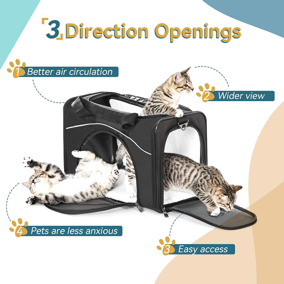 * 【Safety and comfort】The zippers of the 3 openings all use self-locking zippers and built-in safety ropes to prevent pets from escaping;the bottoms of the two placement methods are equipped with soft cushions and the cushions are removable and washable to keep the cushions clean and make the pets more comfortable * 【DURABLE MATERIAL】This pet carrier is made of durable, lightweight and waterproof polyester fiber, plus tight stitching to make the carrier durable;Solid wire structure keeps it from collapsing, flexible enough to compress to fit under an airplane seat;Hard wood board base helps to hold all pets steady * 【MULTIPLE OPENINGS& VENTILSTION DESIGN】 the Dog carrier has 3 openings, and each opening has two non-slip zippers to ensure pet safety. 3 mesh windows with ensure air circulation, facilitating communication between pets and their owners * 【INTIMATE DESIGN】Adjustable shoulder strap design; Side pockets can store small items;The zipper design opening on the back can be safely tied to the trolley case;The two straps at the bottom allow the seat belt to pass through and be fixed on the car seat,or you can bring it on the plane and place it under the seat |
