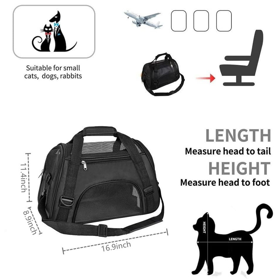 Please note: it's suitable for most small Birds, cats, teacup breeds, and other small pets, lighter than 4 lbs. Please choose your carrier based on your pet's length and height, NOT on weight. Size:16.9x8.9x11.4 inches(LxWxH); 43 x22.7x29CM(LxWxH), Your pets must be smaller than this size, otherwise, they will not be able to hold it. Please measure your pet's size before purchase. The pet carrier has two long handle grips for easy toting, it also comes with a detachable shoulder strap to make a easy to carry. Hand-carrying straps and adjustable padded shoulder straps allow for many carrying options. Four side mesh panels for Ventilation, a full Side Zipper Opening for comfort, and a zipper bag in the front for small things, made from durable and comfortable breathable materials. Airline Approved, ideal for traveling, camping or catching up with your friends, take your pets along with you to provide your pet with a luxurious place to rest! |