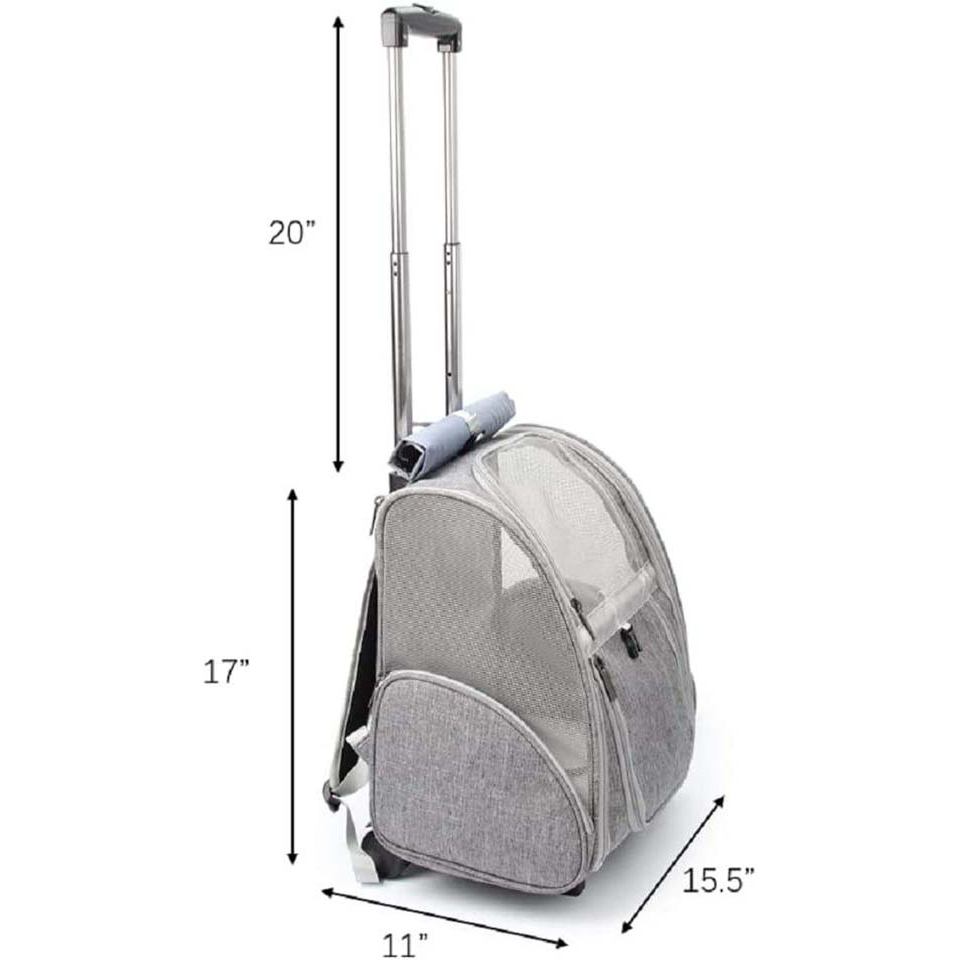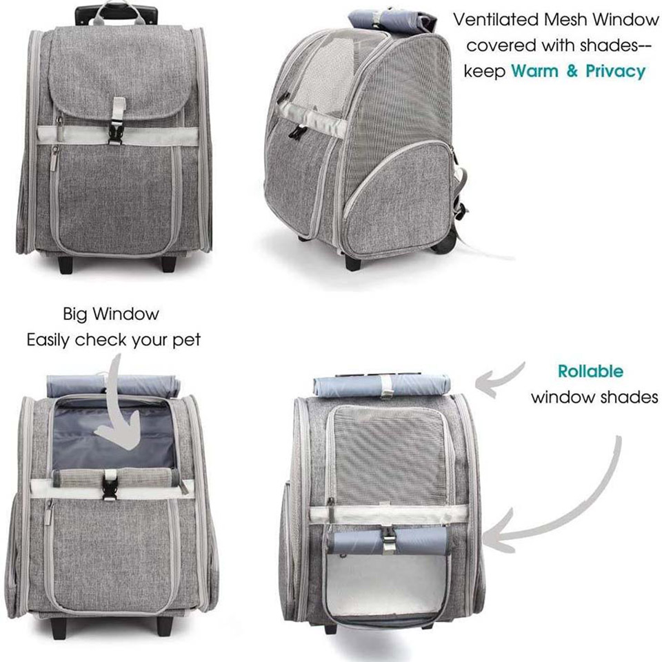bring your dog or cat anywhere. * \uD83D\uDC31【FULLY BREATHABLE MESH DESIGN】 This backpack is three-sided mesh, providing a safe and comfortable travel for your pet. Fully mesh design ensures ventilation and visual-ability, suitable for pets to travel for a long time. * \uD83D\uDC31【THOUGHTFUL DESIGN】The backpack is designed with rollable window shades on front to keep warm and privacy when needed. It is also designed with a strap storage layer to ensure that straps will not get stuck in the wheel when it's used as rolling carrier. * \uD83D\uDC31【DURABLE & FUNCTIONAL】The rolling pet carrier is made with a multi-stage telescope handle. The cat backpack is made of superior material which is scratch-resistant, Waterproof, Easy Clean and Lightweight. It's sturdy for long lasting use. The side pouches is also perfect for a can of friskies or a bag of treats! * \uD83D\uDC31【LARGE SPACE 】Item dimensions: 15.5"L x 11"W x 17"H( Telescopic rod can extend to 20"). FIT UP TO 15 pounds cat and dogs! Perfect for Chihuahua, Deer dog, Pomeranian, Bichon, Corgi, French bulldog, Cats and Other SMALL SIZE pet. |