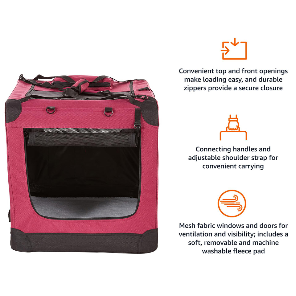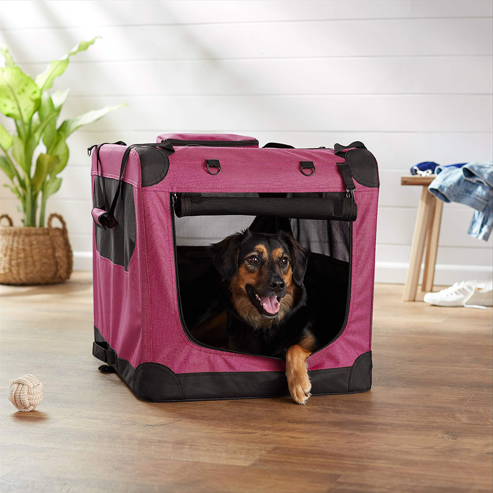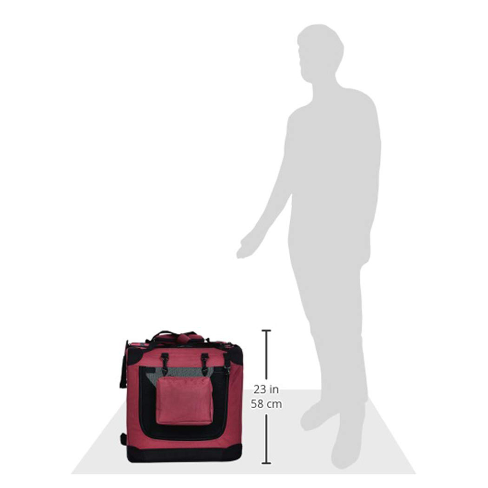 Durable polyester and PVC material with sturdy zipper closures for secure containment Top handle and shoulder strap for easy carrying; folds flat for compact storage Multiple screened panels for ventilation and visibility; machine-washable soft fleece pad for comfort; handy pockets on top and sides for storing treats, toys, and more Note: Your dog should be able to stand up and turn around comfortably while in the crate. Measure from nose to base of tail when standing, and from top of head to floor. Add 4 inches to those measurements to confirm optimal crate height and length. Product Dimensions: 26 x 18 x 18 inches (LxWxH) |