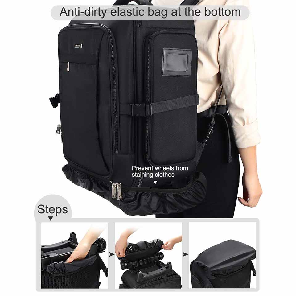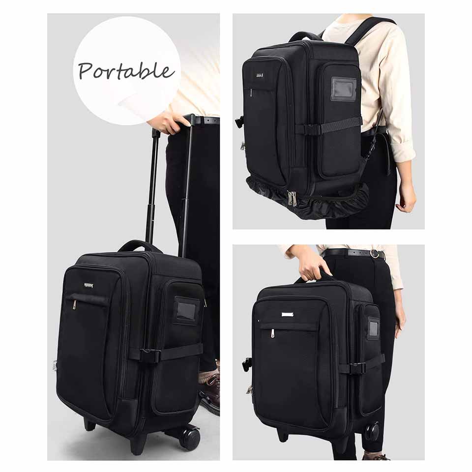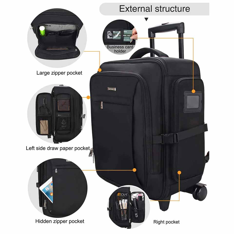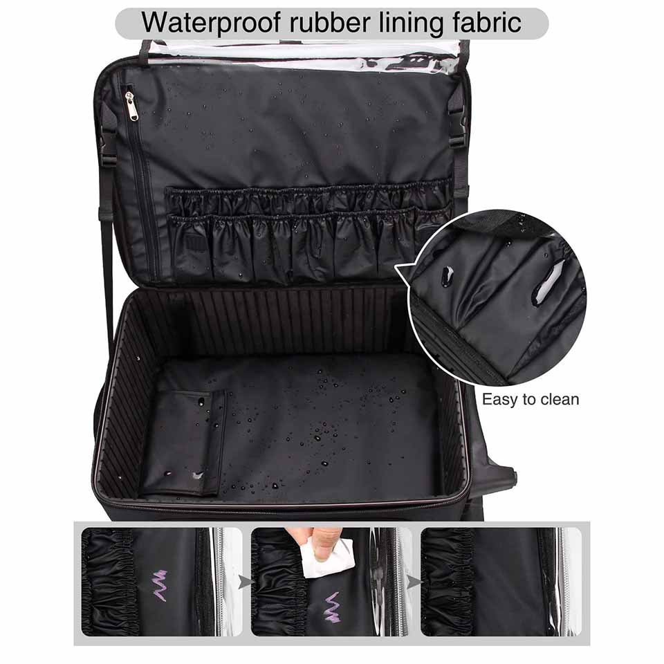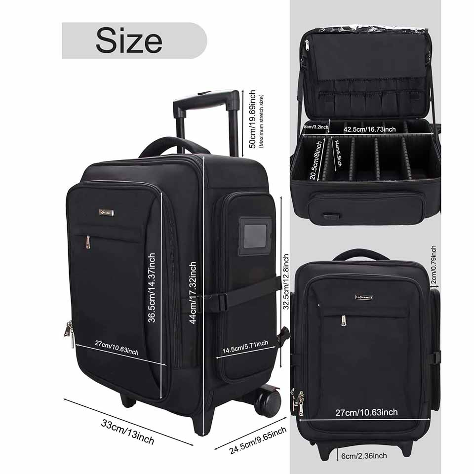 * Two Sets of Adjustable Dividers: The rolling makeup backpack comes with two sets of different height-adjustable dividers. It can be flexible with use. DIY your makeup case organizer with adjustable padded dividers. You can design internal compartments by the adjustable padded dividers. Multi-movable Partition gives your freedom to arrange the space. * Convenient Carrying: The tie rod is made of aluminum alloy, which is not easy to bend and can bear more weight, and it can freely adjust the length at your needs. Breathable and adjustable straps of this rolling makeup case for makeup artists can be tucked away into the zipper pocket, so they are not dragging while the backpack is rolling. can be used as a backpack when going up stairs or roll when moving to a new area. Built-in a elastic wheels cover, it won’t get your clothes dirty when carry it on your back. * Waterproof Durable Material: The rolling makeup backpack well made of high quality Oxford Fabric, which is waterproof and durable to use. The lining of the rolling makeup backpack also use waterproof fabric to made, easy to clean if it get dirty, offer a better clean way to all makeup artists. The zipper head of the main compartment has holes can be locked with a TSA lock. Made of high quality zippers for durability. The click buckles on the sides to support the zipper. * Special Design and Multi-purpose: There is a insulation compartment of the right side of the backpack, great for storing curling irons and straighteners even if they are hot after use. On the left side of the backpack, built in USB charger port outside and built in charging cable inside. It offers you a more convenient way to charge your phone. The rolling makeup backpack is a very sturdy travel kit great for MUA’s on the go. It is an easy way of carrying your makeup stuff. Perfect for traveling makeup artists. |