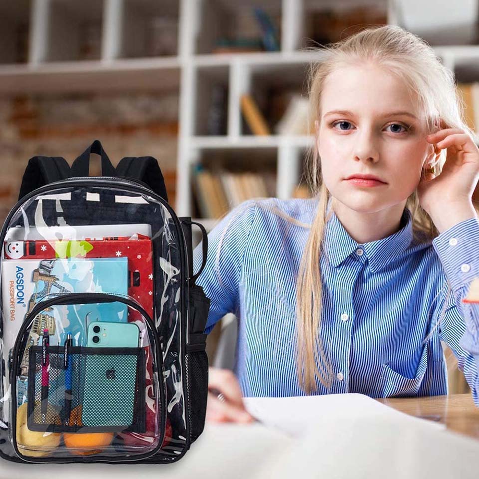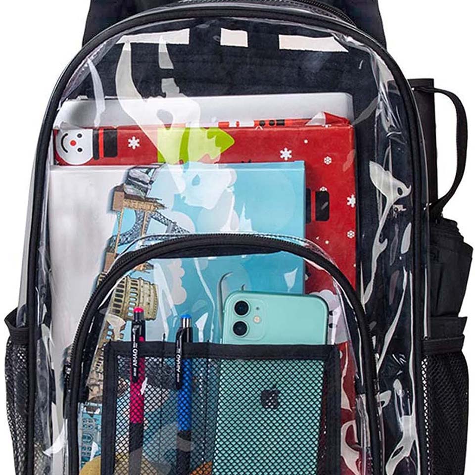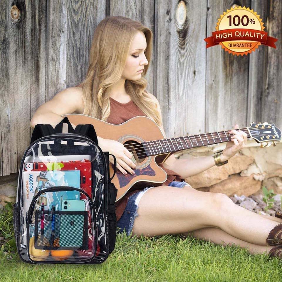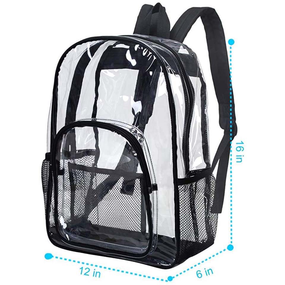 * 16" shoulder drop * 【UPGRADE MATERIAL】- The material of this transparent bag is customized by environmentally-friendly and cold resistant, It is safe for your health and you don't worry it will crack in cold winter. * 【REINFORCED BASE】- Reinforced the material under bottom, improve the bottom corner of the book bag ripped apart problem. * 【STADIUM APPROVED CLEAR BACKPACK】-Made of heavy duty 0.3 mm Clear PVC,Transparent Backpack with Completely see through all around, including back. * 【GET THROUGH SECURITY HASSLE- FREE】-Take this amazing, see-through backpack to all your football matches, sports games, concerts, parties and festivals with peace of mind. * 【LARGE CAPACITY】-With a large main compartment, as well as a spacious front zipper pocket for easy access to your most frequently used accessories and two mesh side pockets perfect. |