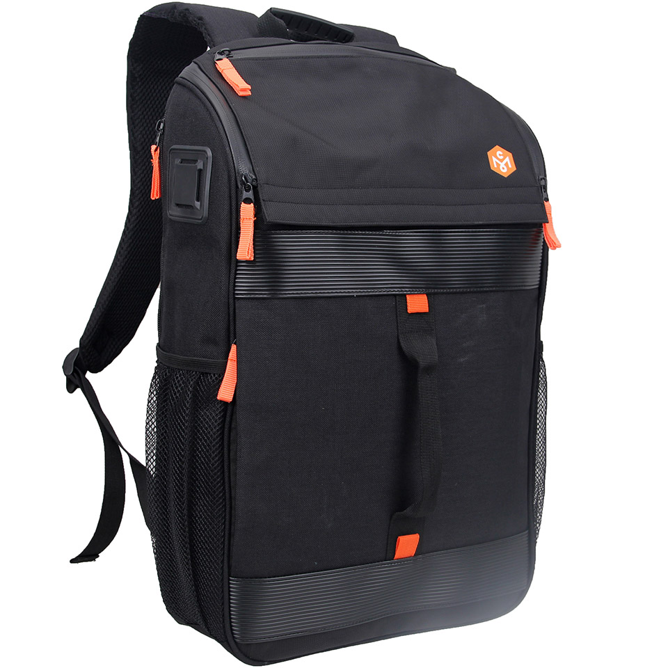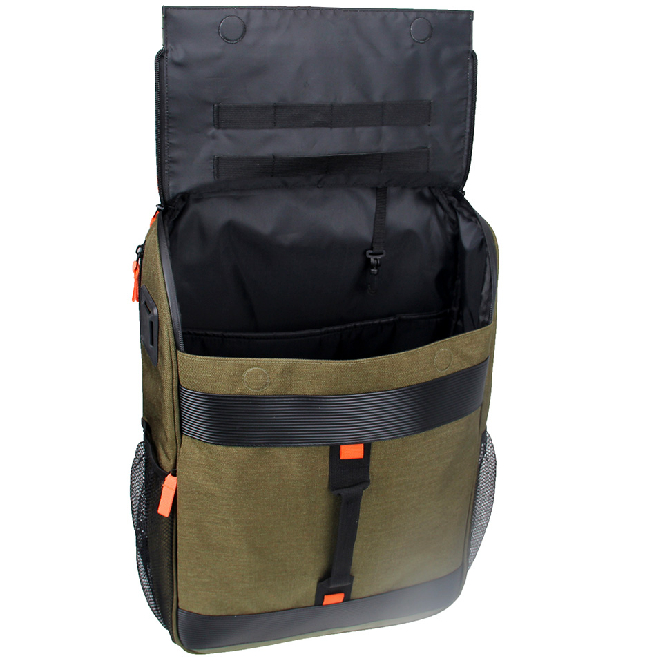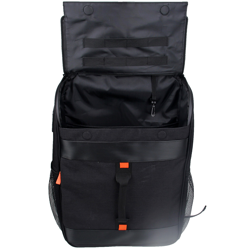 Zip main opening with waterproof zipper; Magnetic closure side accessory pockets' Stretch mesh side pockets; Roomy zipped front pocket and water bottle pocket; Features fleece padding to protect laptops and tablets. |