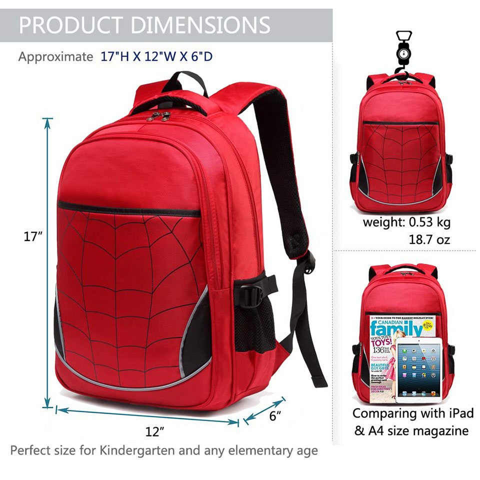 * Dimensions : Approximate 17"H X 12"W X 6"D * Large Capacity: 3 separate different size pockets with high quality zippers,1 front pocket,2 meshed side pockets;Provide roomy space for daily necessities storage and organization. * Adjustable S-shape shoulder straps,comfortable to carry;A strap and a soft padded handle on the top;Sturdy constructions. * Adorable color,durable,stylish design, spider pattern print. |